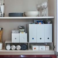 ラックを食器棚などのお好みの場所に設置後、その上にお手持ちの収納ボックスやファイルボックスを置いてください。下部の空間を収納スペースとして活用でき、収納力をアップできます。