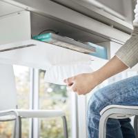 テーブルの上にあるものをラックに入れるだけで、いつでも片付いた広々としたテーブルに。テーブルの拭き掃除もスムーズにできるので、清潔に保てます。