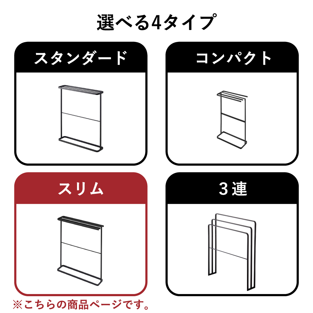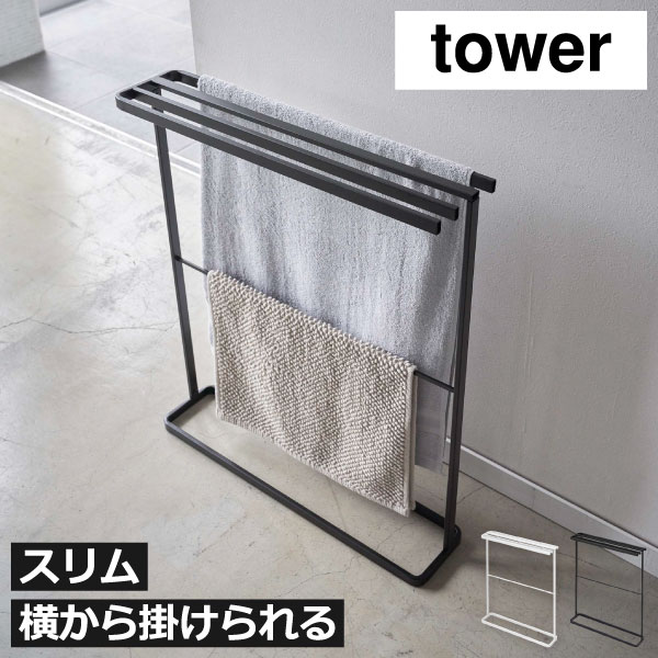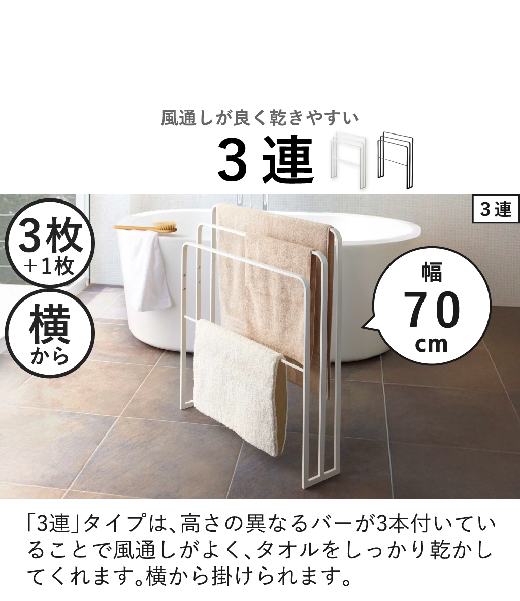 タオル類を省スペース複数枚干せる、towerのバスタオルハンガースタンドです。このバスタオルハンガースタンドは、様々な空間に馴染むシンプルなデザイン。奥行きは15cm以下とスリムなバスタオルハンガースタンドなので、ランドリールームや廊下、リビングなどに置いても場所を取りません。洗濯機横などの隙間にも設置できる、省スペースなバスタオルハンガースタンドです。バスタオルハンガースタンドのバーの間隔は広いので、バスタオル同士が重なりません。通気性が良いことでタオル類がしっかり乾き、いつも衛生的に保てるのはうれしいですね。置く場所を選ばない自立タイプのバスタオルハンガースタンドなので、持ち運びも簡単にでき、使いたい場所で活躍してくれます。下段のバーには、バスマットも一緒に収納することができて便利です。バスタオルハンガースタンドは丈夫なスチール製で、より長くお使いいただけます。「スタンダード」「コンパクト」「スリム」「3連」の4タイプから、お好みで選択可能。「スタンダード」タイプは使いやすいシンプルモデルで、上から掛けられます。「コンパクト」「スリム」「3連」タイプはサイドが開いていて、横から掛けられます。バスタオルハンガースタンドは、それぞれホワイトとブラックの2色から選べます。