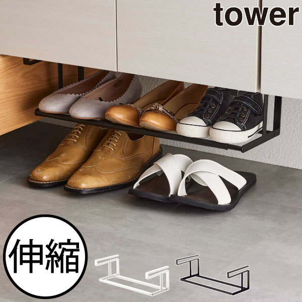 玄関の下駄箱に差し込んで設置できる、省スペースなシューズラックです。下駄箱下の空間を活かして、よく履く靴の一時収納や、雨に濡れた靴の風通しに◎。左右のフックを棚板に差し込むだけの簡単設置で、手軽に収納スペースをプラス。大人用のシューズやサンダルなら、2〜4足まで収納できます。約45.5〜80cmの間で伸縮できるから、ご自宅の棚に合わせて調整可能。浮かせて収納できることで、ラック下のお掃除が楽にできるのも嬉しいポイントです。靴だけでなく、ホウキやトングなどの掃除用品の収納場所としても活躍。どうしても出てしまう生活感を隠してスマートに収納できるから、来客時も安心。色は、ホワイトとブラックの2色からお選びいただけます。