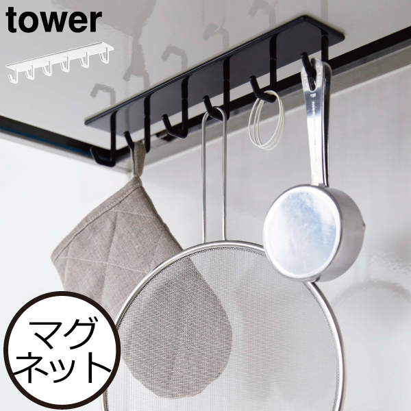 収納力のある6連フックでキッチンツールをひとまとめに。お玉やフライ返しなどの調理道具や鍋つかみ、計量スプーンなどの定位置にぴったりです。