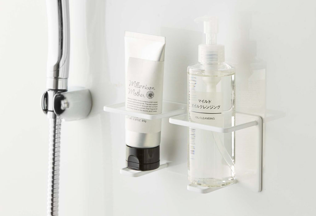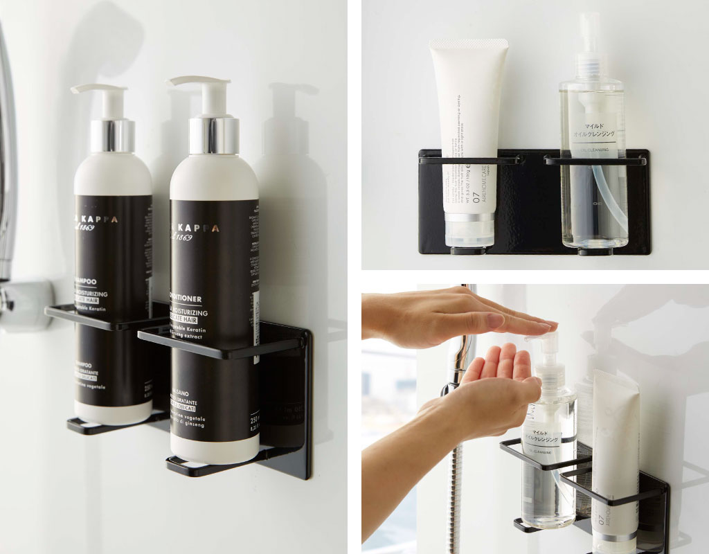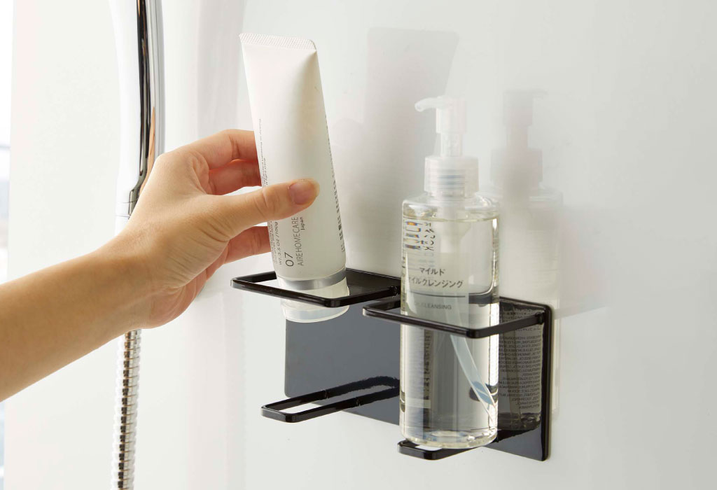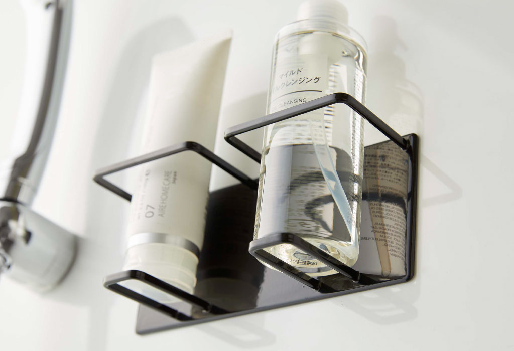お風呂で使うチューブやボトルを、浮かせて収納できるバスラックです。倒れやすい洗顔フォームやクレンジングを、一緒に立てて収納できるダブルタイプ。強力マグネットで浮かせて収納できるから、面倒なお風呂掃除が楽に。ボトルを収納した場合は、都度取り出すことなくそのままプッシュ可能。接地面が少ないことで、ぬめりの発生を抑え、いつも清潔に保つことができます。耐水性に優れた丈夫なスチール製で、より長くお使いいただけます。光沢のある洗練されたデザインが、インテリアに馴染み、空間をよりおしゃれに演出。色は、ホワイトとブラックの2色からお選びいただけます。