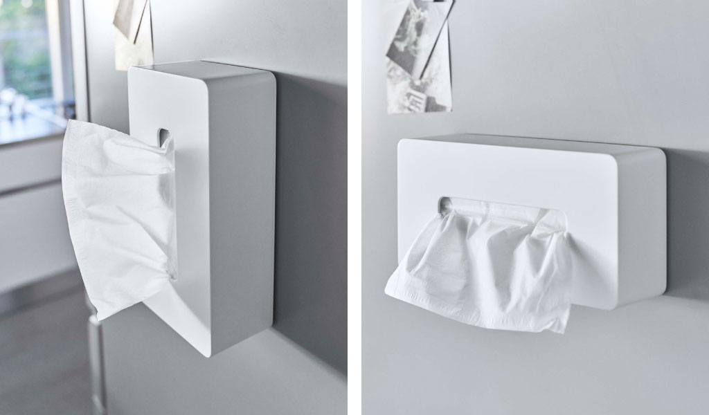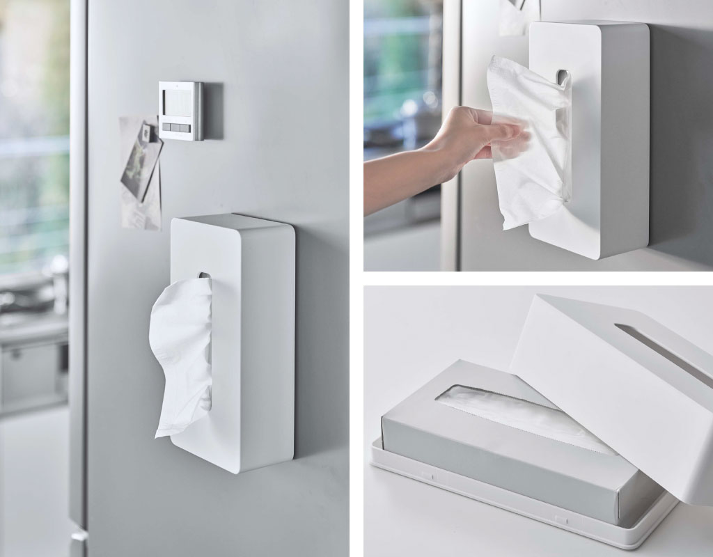冷蔵庫にぴたっと設置できるマグネット付きティッシュケースです。カウンターに置くと場所を取りがちなティッシュボックスを、スマートに壁面に収納。シンプルなデザインが様々なインテリアに馴染み、空間をよりおしゃれに演出。色は、ホワイトとブラックの2色からお選びいただけます。