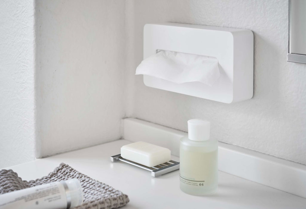 ソフトタイプのティッシュをそのまま収納できる、コンパクトなティッシュケースです。生活感が出てしまうパッケージを隠せるから、すっきりとした印象に。ソフトパックがすっぽり納まる、無駄のないサイズ感で、圧迫感を与えません。リビングや寝室、玄関やサニタリーなど、置く場所を選ばないのも◎。台座にソフトパックを置いて、本体を被せるだけだから、詰め替えも簡単です。軽量だから、テーブル上の掃除の際など、ちょっと移動させたい時に便利。プラスチック製のため、ホコリが付いてもさっと拭くだけだから、お手入れも楽々。壁に取り付けられる木ネジ付きで、お好みの場所に浮かせて設置できます。色は、ホワイトとブラックの2色からお選びいただけます。