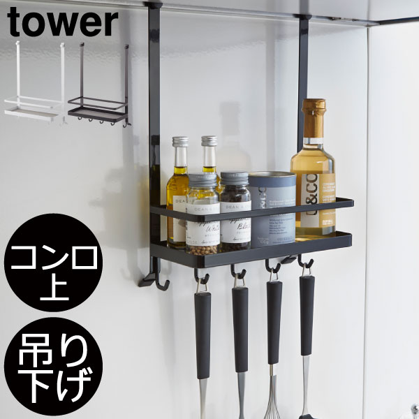 調味料を浮かせて収納し、コンロ回りがスッキリする「レンジフード調味料ラック タワー」。ラックには滑り止めマットが付いているので、置いた調味料が滑りにくく、倒れにくくなります。ラックの下には、5つのフックが付いており、お料理の際にサッと手に取れるので、引き出しを開けるなどの手間を省けます。調味料を上に浮かせて収納できるので、油はねが気になる方にもおすすめです。レンジフードの溝に引っ掛けてネジで固定するだけの簡単設置。ラックが浮かないように壁との間に固定する脚が付いているので、ぐらつかないで安定します。脚には、シリコーンキャップが付いているので、壁が傷つくのを防ぎます。シンプルで圧迫感を感じさせないデザインで、キッチンツールのカラーにも合わせやすい白と黒の2色からお選びいただけます。
