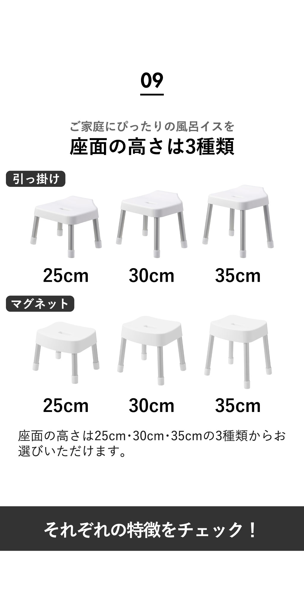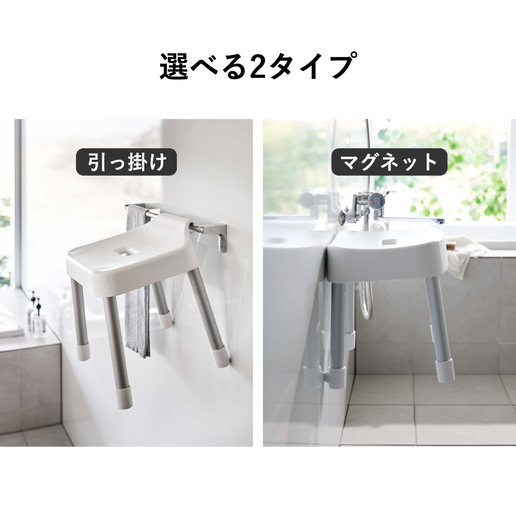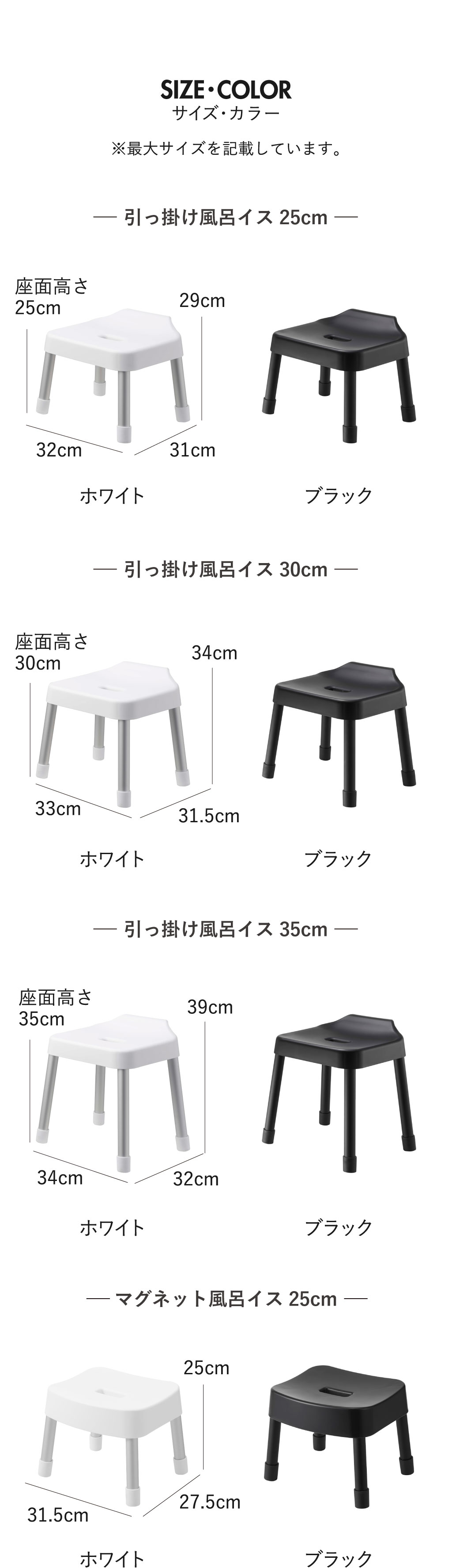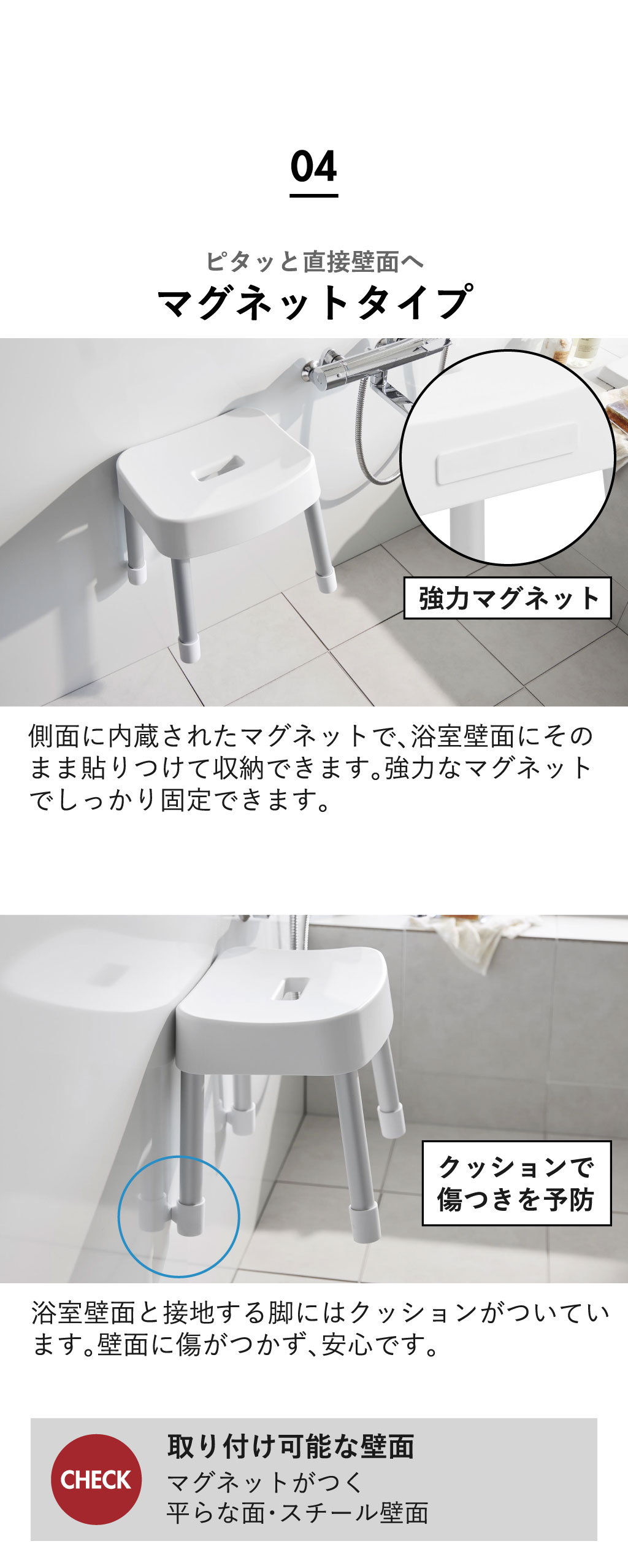 浴室壁面にすっきり収納できる、シンプルなお風呂椅子です。背もたれがフック状になっている引っ掛けタイプと、強力な磁石を内蔵したマグネットタイプ、2つの収納方法をご用意しました。引っ掛けタイプは浴室内のポールやバーに掛けて、マグネットタイプは浴室壁面に直接貼りつけて収納できます。お風呂椅子を浮かせて収納することで、水切れがよく、しっかりと乾かすことができます。カビやヌメリの予防にもなり、衛生的です。浴室の床掃除もスムーズにできて、清潔なバスルームを保てます。お風呂椅子の脚は錆に強いアルミ製です。滑り止め効果のあるキャップつきで、安心して座れます。軽量設計なので、お掃除のときもサッと持ち上げて移動できます。お風呂椅子の座面は緩やかにカーブしており、座り心地も快適です。耐荷重も約100kgと、しっかりとしたつくりです。お風呂椅子の座面の高さは25cm・30cm・35cmの3種類。お揃いの湯おけ・手おけで統一感のある空間を演出するのもおすすめです。お風呂椅子単品・2点セット・3点セットからお好みの組み合わせをお選びください。機能性と清潔感を兼ね備えたお風呂椅子で、心地よいバスタイムを。