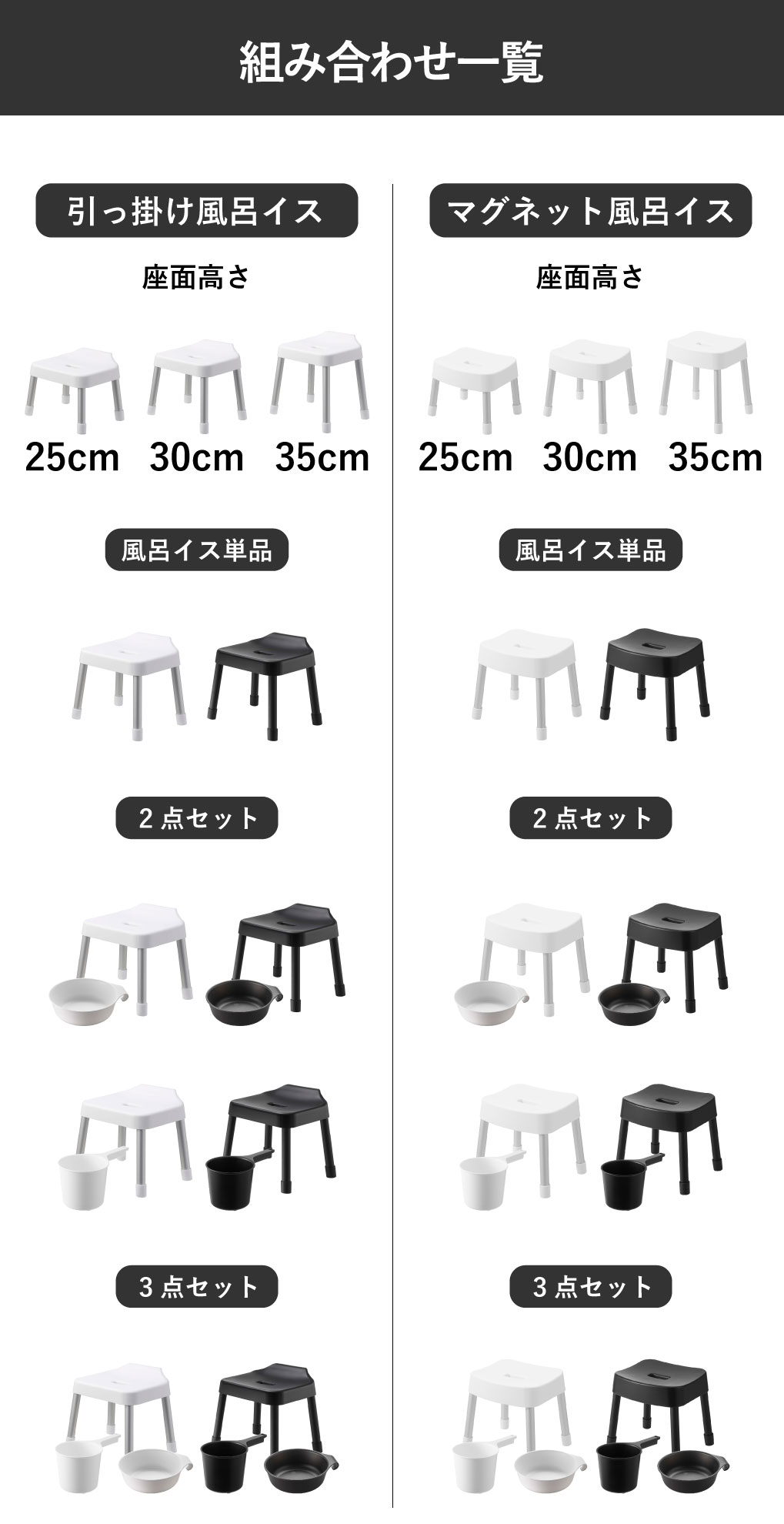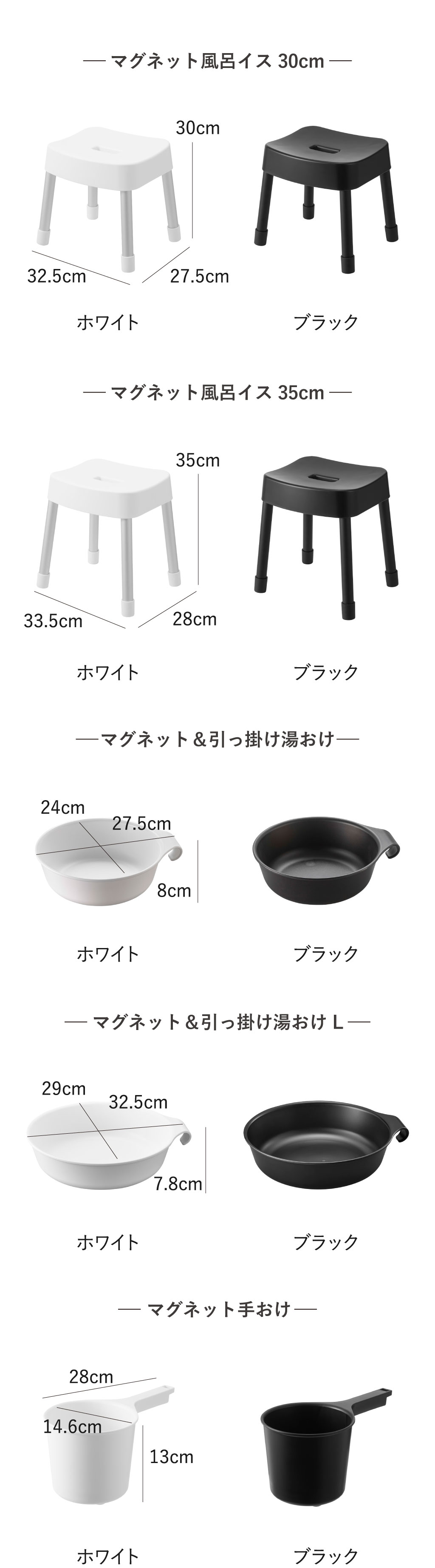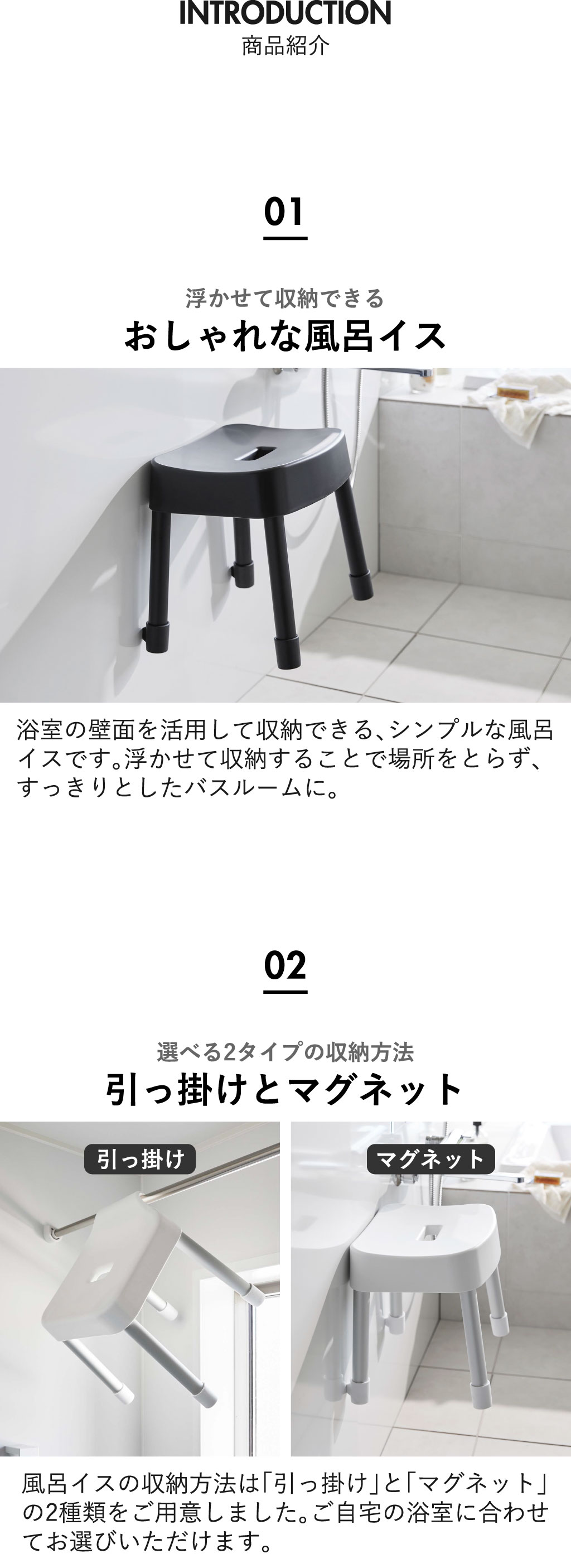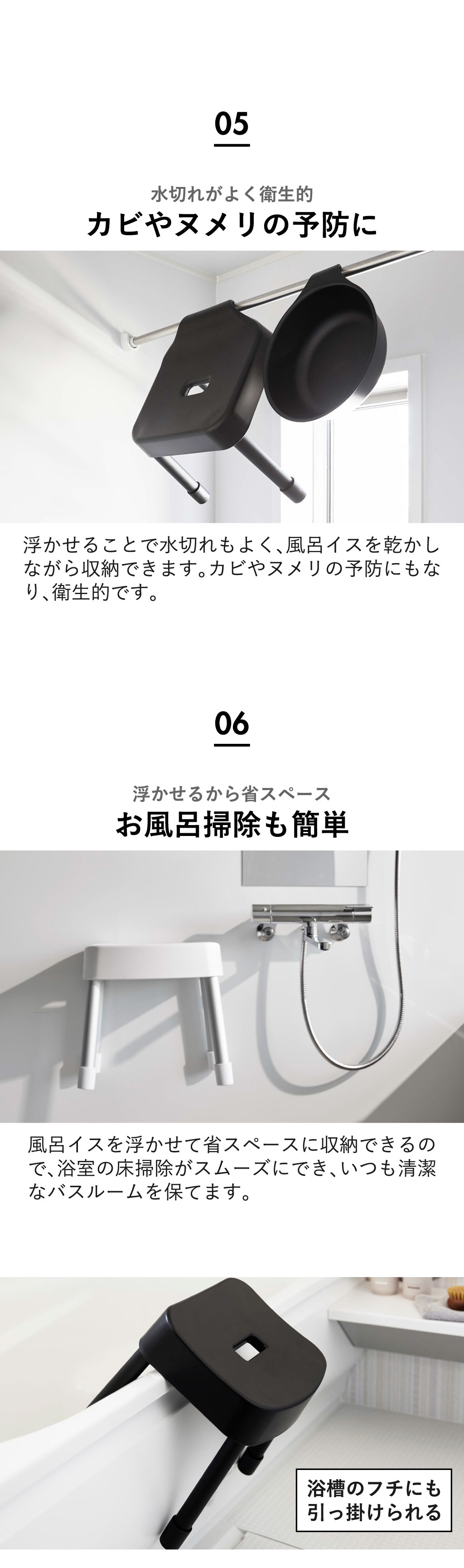 浴室壁面にすっきり収納できる、シンプルなお風呂椅子です。背もたれがフック状になっている引っ掛けタイプと、強力な磁石を内蔵したマグネットタイプ、2つの収納方法をご用意しました。引っ掛けタイプは浴室内のポールやバーに掛けて、マグネットタイプは浴室壁面に直接貼りつけて収納できます。お風呂椅子を浮かせて収納することで、水切れがよく、しっかりと乾かすことができます。カビやヌメリの予防にもなり、衛生的です。浴室の床掃除もスムーズにできて、清潔なバスルームを保てます。お風呂椅子の脚は錆に強いアルミ製です。滑り止め効果のあるキャップつきで、安心して座れます。軽量設計なので、お掃除のときもサッと持ち上げて移動できます。お風呂椅子の座面は緩やかにカーブしており、座り心地も快適です。耐荷重も約100kgと、しっかりとしたつくりです。お風呂椅子の座面の高さは25cm・30cm・35cmの3種類。お揃いの湯おけ・手おけで統一感のある空間を演出するのもおすすめです。お風呂椅子単品・2点セット・3点セットからお好みの組み合わせをお選びください。機能性と清潔感を兼ね備えたお風呂椅子で、心地よいバスタイムを。