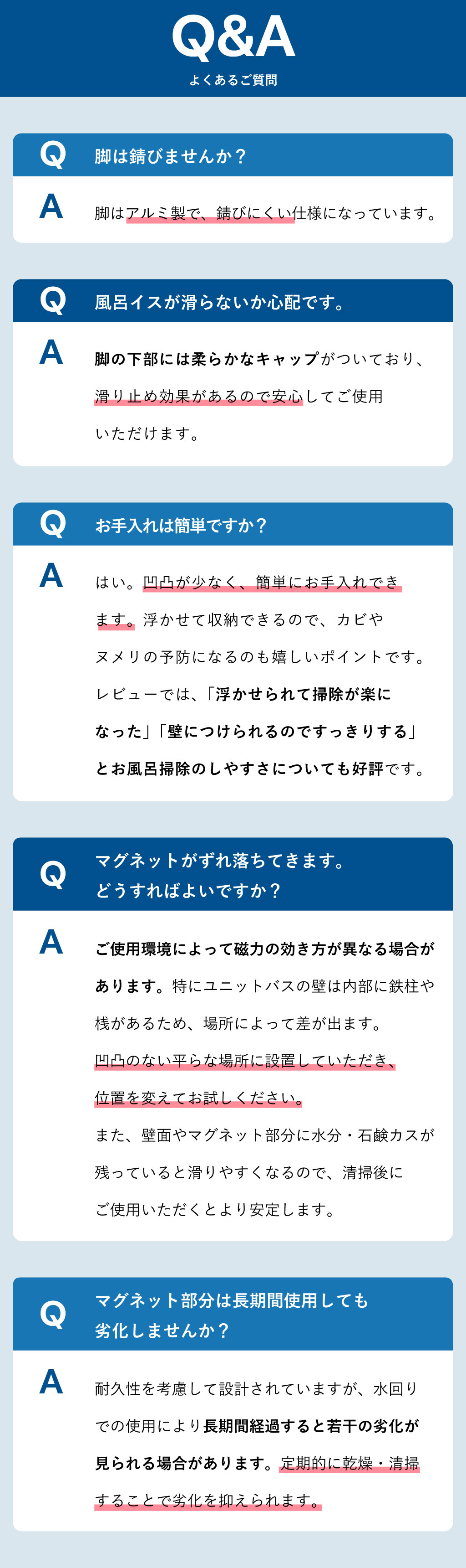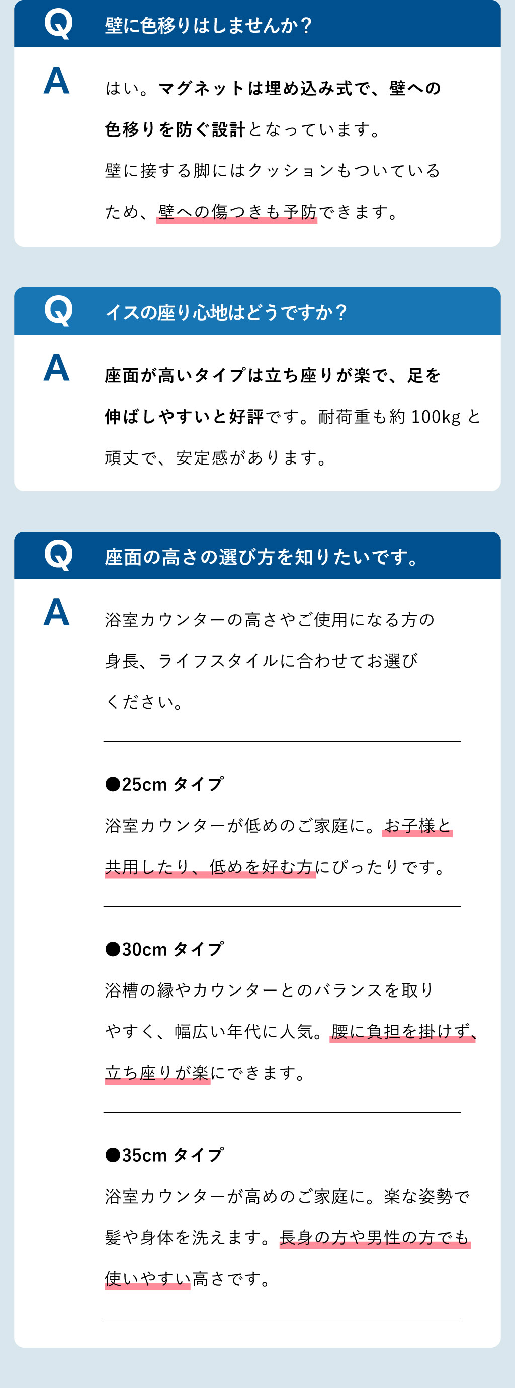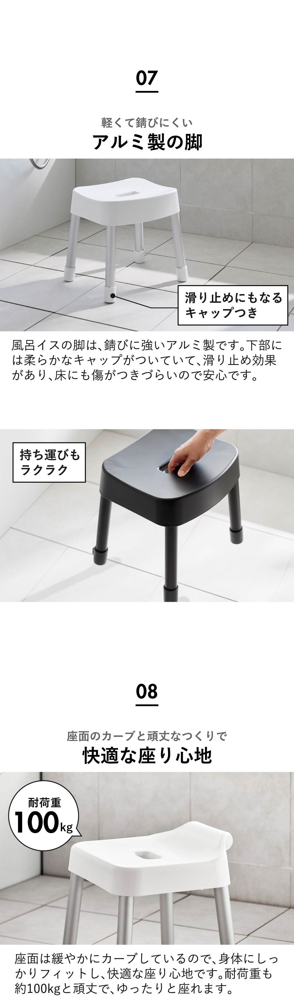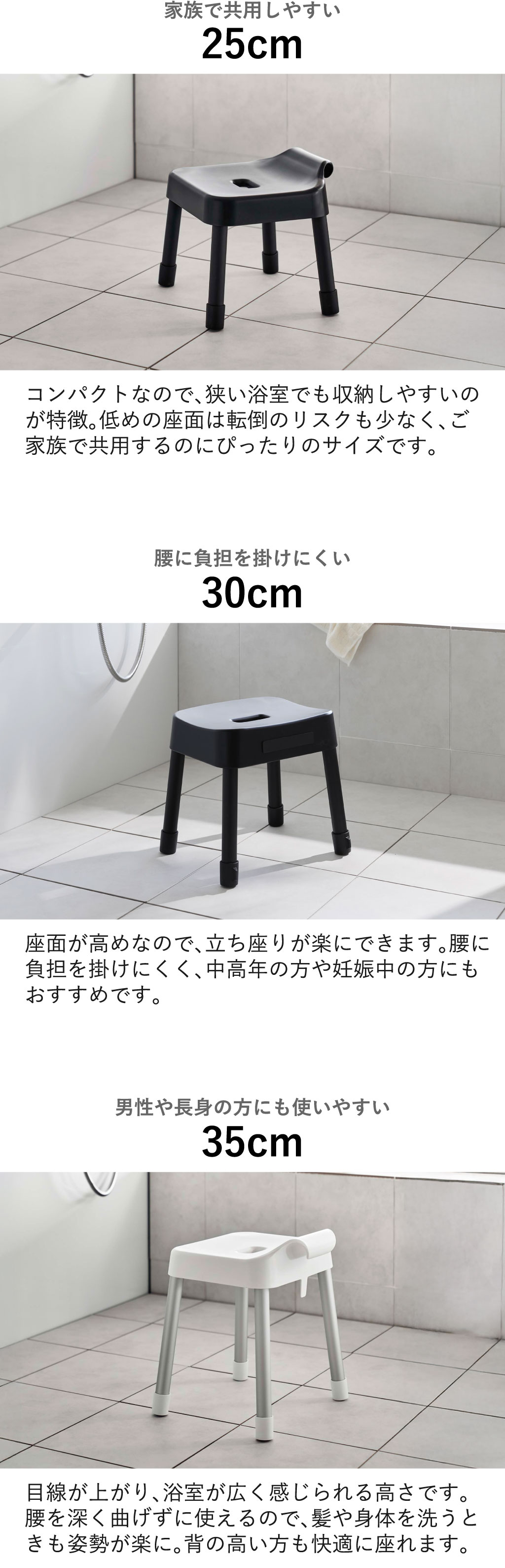 浴室壁面にすっきり収納できる、シンプルなお風呂椅子です。背もたれがフック状になっている引っ掛けタイプと、強力な磁石を内蔵したマグネットタイプ、2つの収納方法をご用意しました。引っ掛けタイプは浴室内のポールやバーに掛けて、マグネットタイプは浴室壁面に直接貼りつけて収納できます。お風呂椅子を浮かせて収納することで、水切れがよく、しっかりと乾かすことができます。カビやヌメリの予防にもなり、衛生的です。浴室の床掃除もスムーズにできて、清潔なバスルームを保てます。お風呂椅子の脚は錆に強いアルミ製です。滑り止め効果のあるキャップつきで、安心して座れます。軽量設計なので、お掃除のときもサッと持ち上げて移動できます。お風呂椅子の座面は緩やかにカーブしており、座り心地も快適です。耐荷重も約100kgと、しっかりとしたつくりです。お風呂椅子の座面の高さは25cm・30cm・35cmの3種類。お揃いの湯おけ・手おけで統一感のある空間を演出するのもおすすめです。お風呂椅子単品・2点セット・3点セットからお好みの組み合わせをお選びください。機能性と清潔感を兼ね備えたお風呂椅子で、心地よいバスタイムを。