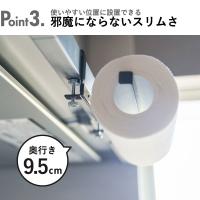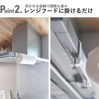 レンジフード周りのデッドスペースを活かして設置できる、キッチンペーパーホルダーです。ご家庭のレンジフードに引っ掛けて、調節ネジでしめるだけの簡単設置。浮かせて収納できるから、いつも清潔で、コンロ周りの掃除も楽々です。スリムな奥行きで、レンジフードのどこに設置しても邪魔になりません。使いやすい位置に設置できることで、さっと手に取れて便利です。直径11cm×高さ24cm以内のロールタイプであれば、キッチンクロスも収納できます。ホルダー部の先端が曲がっているので、ロールをしっかりホールドしてくれます。向きは組立て時に変更できるので、設置場所に合わせて左右どちら向きでも対応。丈夫なスチール製で、キズや汚れに強く、汚れても拭くだけだからお手入れも簡単。レンジフードに触れる部分にはクッションが付いているため、レンジフードが傷付いてしまうのを防いでくれます。色は、ホワイトとブラックの2色からお選びいただけます。