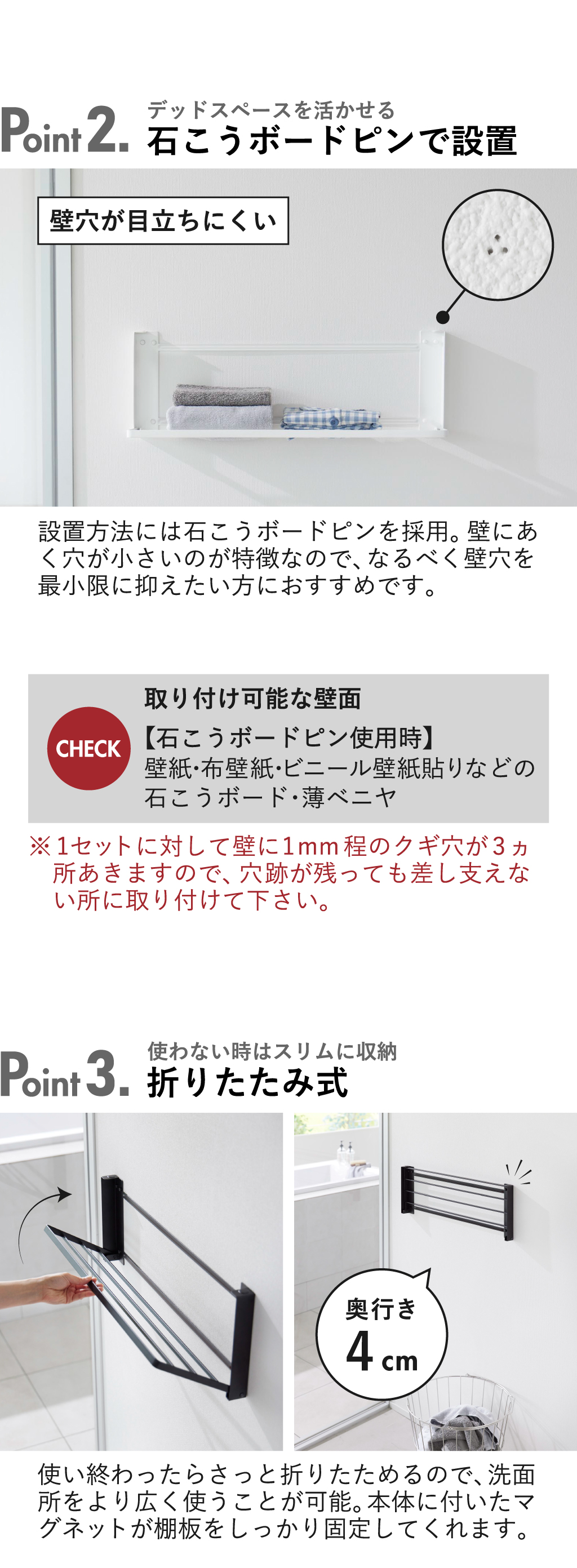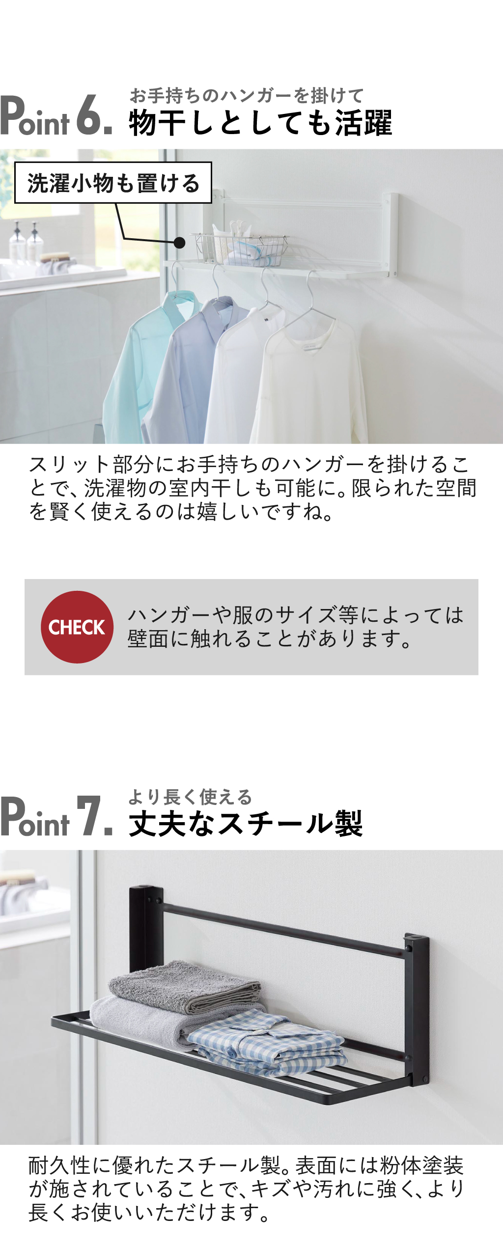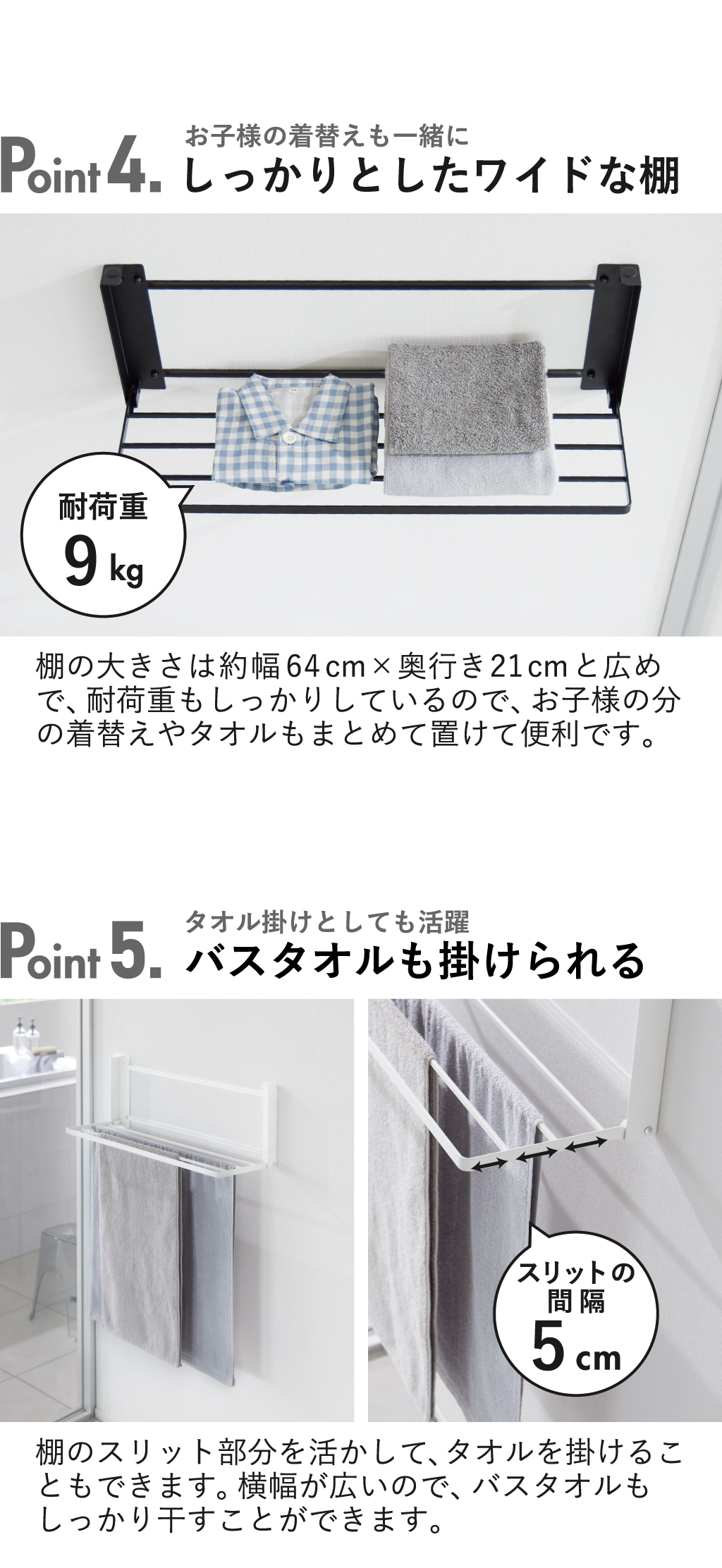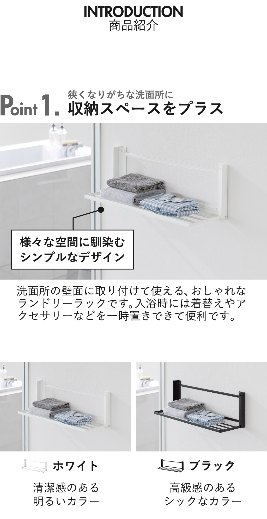 洗面所の壁面に取り付けて使える、おしゃれなランドリーラックです。手狭になりがちな洗面所に収納スペースを増やせるので、入浴時の着替え置きに便利。設置方法には、壁穴が目立たない付属の石こうボードピンを使用します。使いやすい高さに設置できるので、さっと手に取れて作業がスムーズに。棚は使い終わったらコンパクトに折り畳めるので、洗面所をより広く使えます。ランドリーラックの棚の面積は広く、耐荷重にも優れているので安心です。ワイドな棚のスリット部分を活かして、バスタオルを掛けることができます。ランドリーラックにお手持ちのハンガーを掛ければ、洗濯物の室内干しも可能に。限られた空間を賢く使えるのは、嬉しいポイントですね。丈夫なスチール製なので、キズや汚れに強く、より長くお使いいただけます。ランドリーラックの色は、ホワイトとブラックの2色からお選びいただけます。