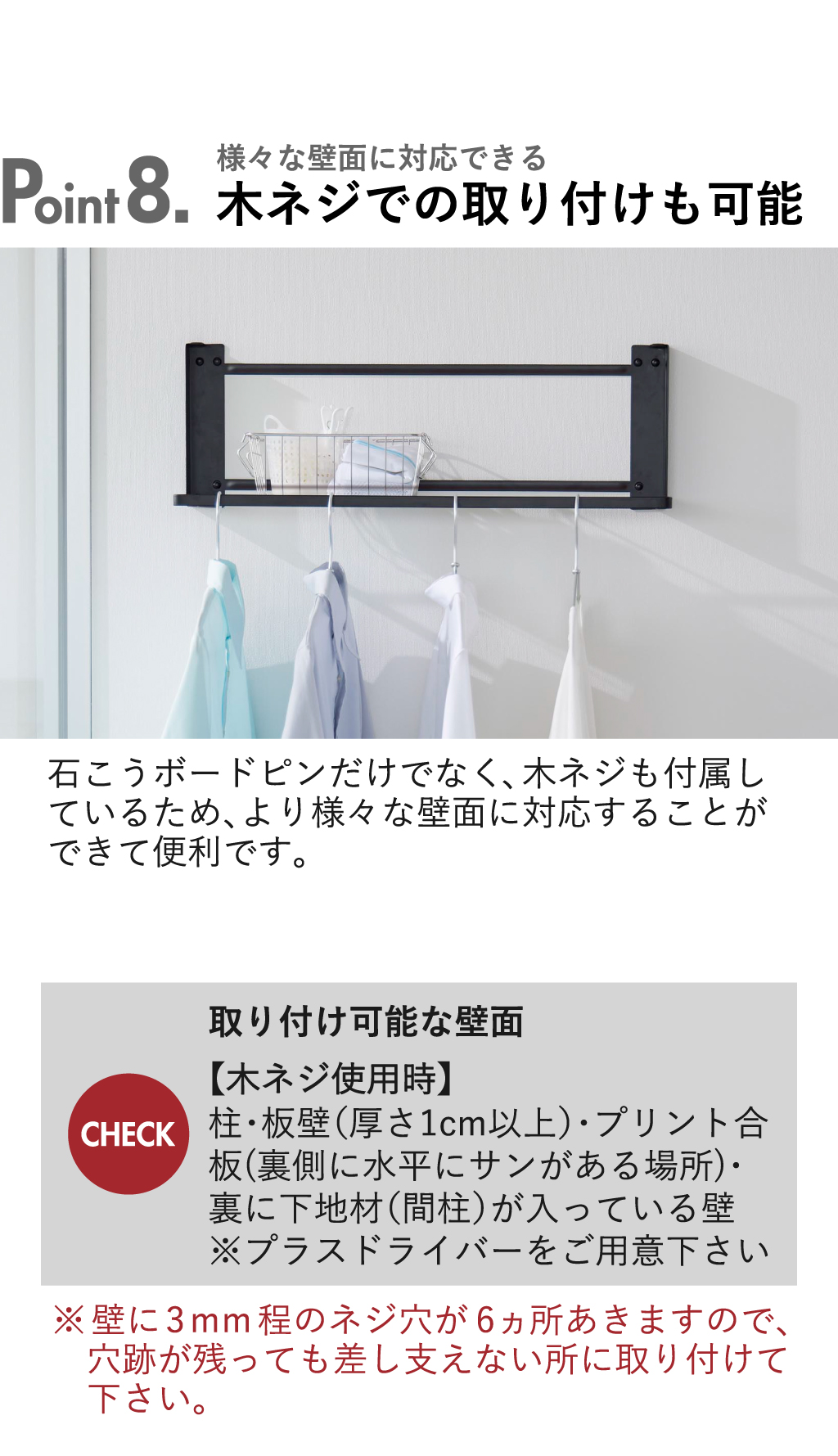 | 付属品 | 石こうボードピンセット×6、木ネジ×6 |