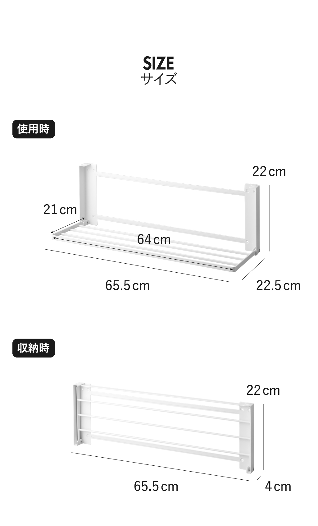| サイズ | 使用時:約幅65.5cm×奥行き22.5cm×高さ22cm 収納時:約幅65.5cm×奥行き4cm×高さ22cm (内寸) 棚:約幅64m×奥行き21cm |