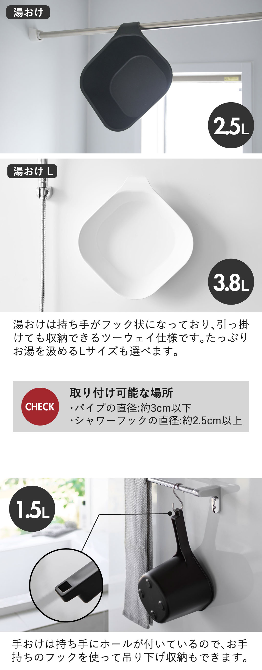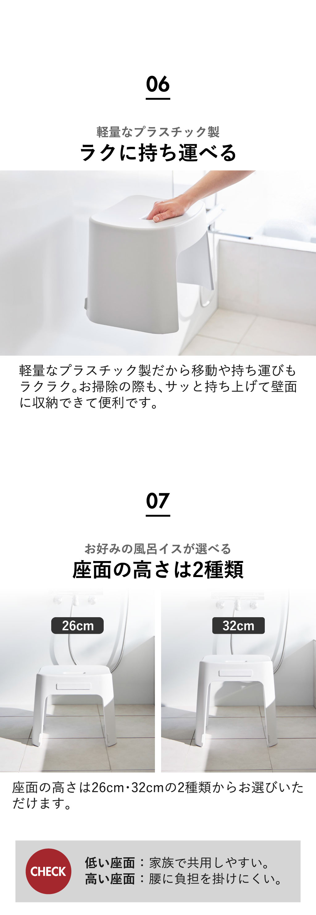 山崎実業 風呂イスシリーズから洗いやすいマグネットタイプのお風呂椅子が登場。側面に内蔵されている強力なマグネットで、使用後は浴室壁面にそのまま貼りつけて収納できます。裏側は凸凹の少ない構造になっており、汚れが溜まりにくく、サッと洗えてお手入れも簡単。お風呂椅子を浮かせて収納することで水切れがよく、しっかり乾かすことができます。カビやヌメリの予防になり、衛生的に使えるのも嬉しいポイントです。お風呂椅子を壁面に収納できるので、場所を取らず、浴室がすっきりとした印象に。床掃除もしやすくなり、いつでも清潔なバスルームを保つことができます。お風呂椅子の座面は滑らかなカーブ状で座り心地も快適。耐荷重約100kgと頑丈なつくりで、脚には滑り止めもついているので安心です。お風呂椅子は軽量なプラスチック製なので、持ち運びもスムーズに行えます。座面の高さは、家族と共用しやすい「26cm」、立ち座りがラクにできる「32cm」の2タイプ。山崎実業 風呂イスシリーズの湯おけ・手おけを一緒に揃えて、統一感のある空間を演出するのもおすすめです。単品・2点セット・3点セットからお好みの組み合わせをお選びください。山崎実業 風呂イスシリーズで快適なバスタイムを。
