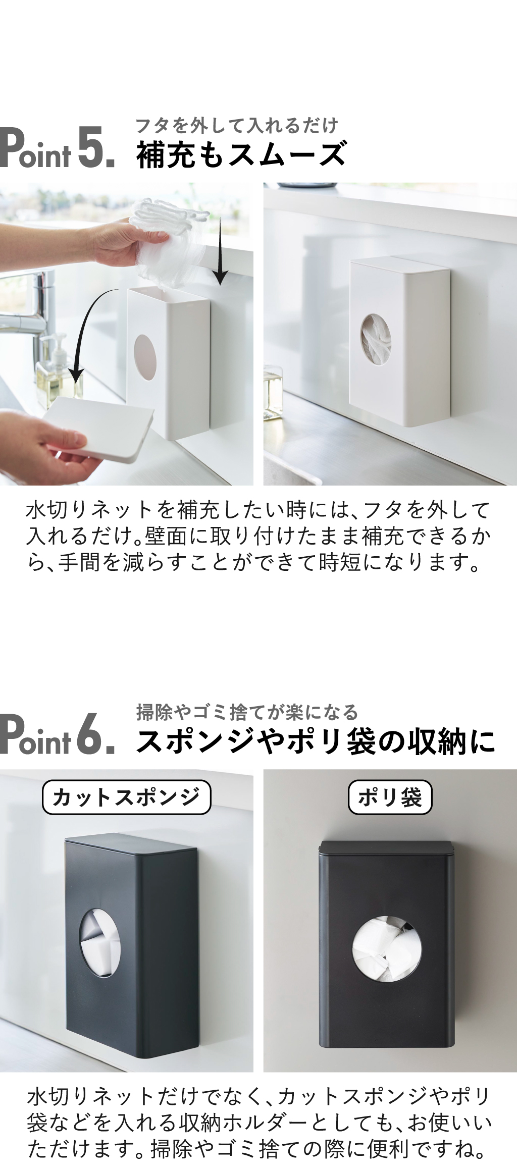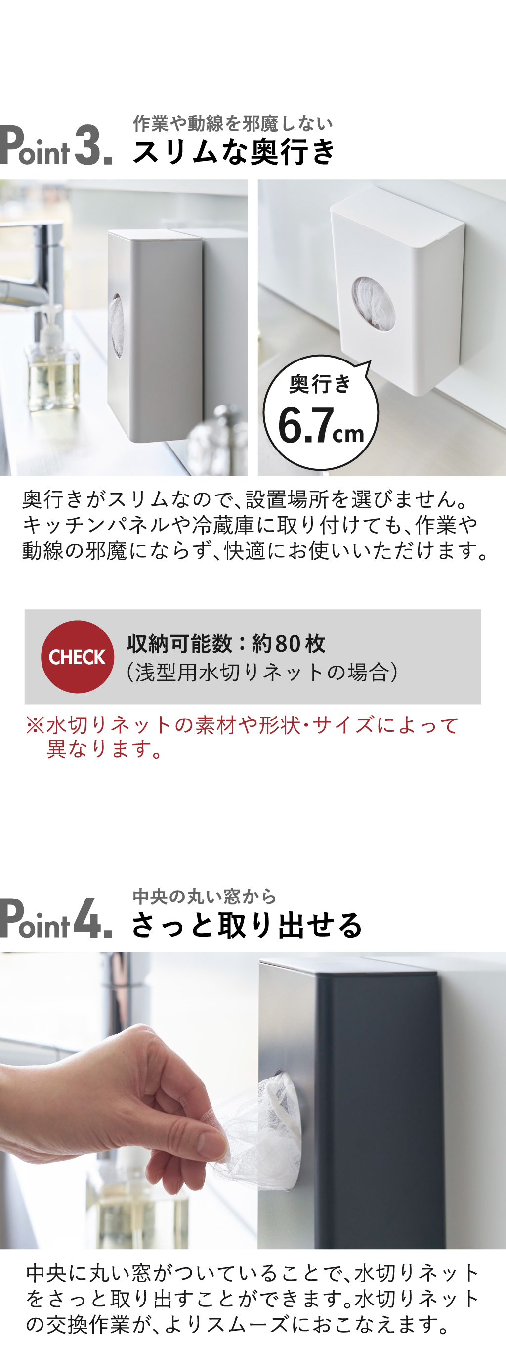 | 収納可能数 | 80枚(浅型用水切りネットの場合) ※水切りネットの素材や形状・サイズによって異なります。 |