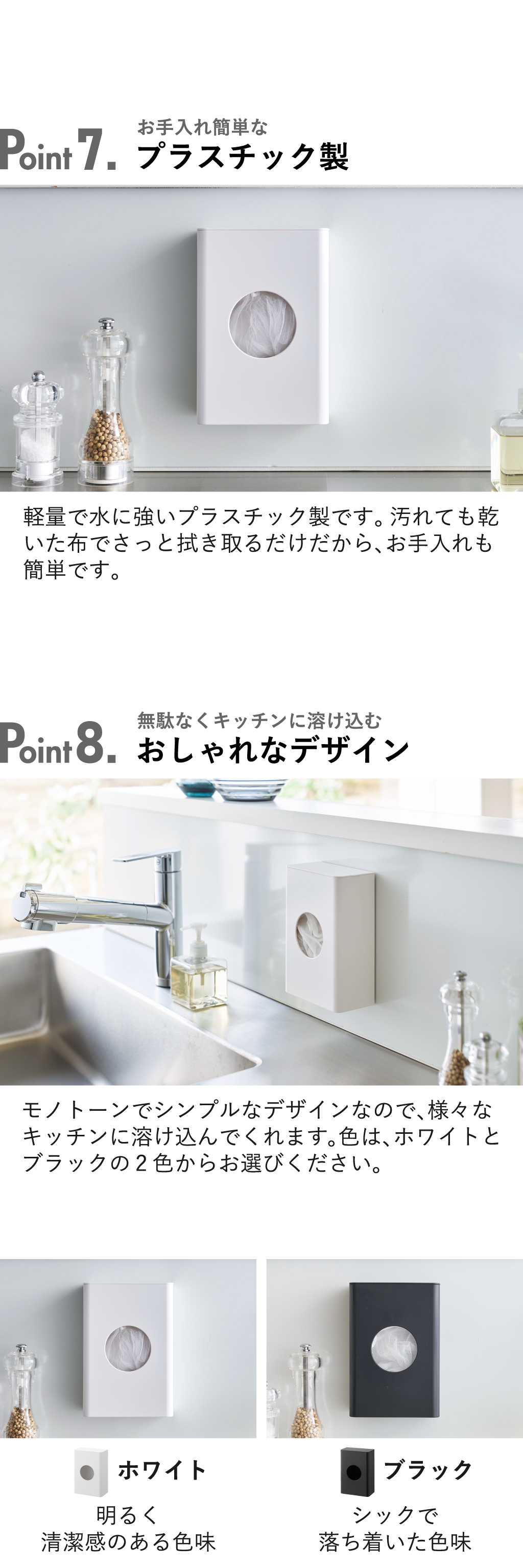 キッチンパネルや冷蔵庫にぴたっと貼れる、towerの水切りネットホルダーです。排水口や三角コーナーに使う水切りネットを、使いやすい場所に浮かせて収納できます。水切りネットホルダーの背面には、強力マグネットがついており、キッチンパネルなどの壁面にしっかりと固定することができます。お好みの場所や高さに、手軽に取り付けることができて、掃除も楽々。スリムな奥行きなので、作業や動線の妨げにならず、快適にお使いいただけます。水切りネットホルダー中央の丸い窓から、さっと取り出せて、交換作業がスムーズに。水切りネットホルダーのフタを外して、ネットを入れるだけで手軽に補充できます。壁面に取り付けたまま補充できるから、手間を減らすことができて時短になります。水切りネットだけでなく、カットスポンジやポリ袋の収納としても活躍。水切りネットホルダーの色は、ホワイトとブラックの2色からお選びいただけます。