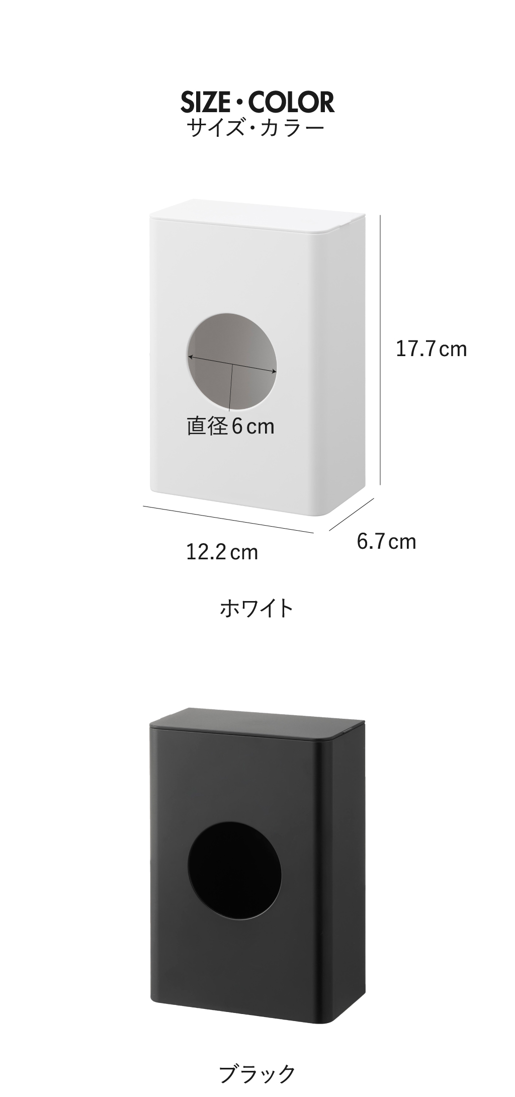| サイズ | 約幅12.2cm×奥行き6.7cm×高さ17.7cm (内寸) フタ開口部:約幅11.6cm×奥行き6.1cm 取り出し口:約直径6cm |
