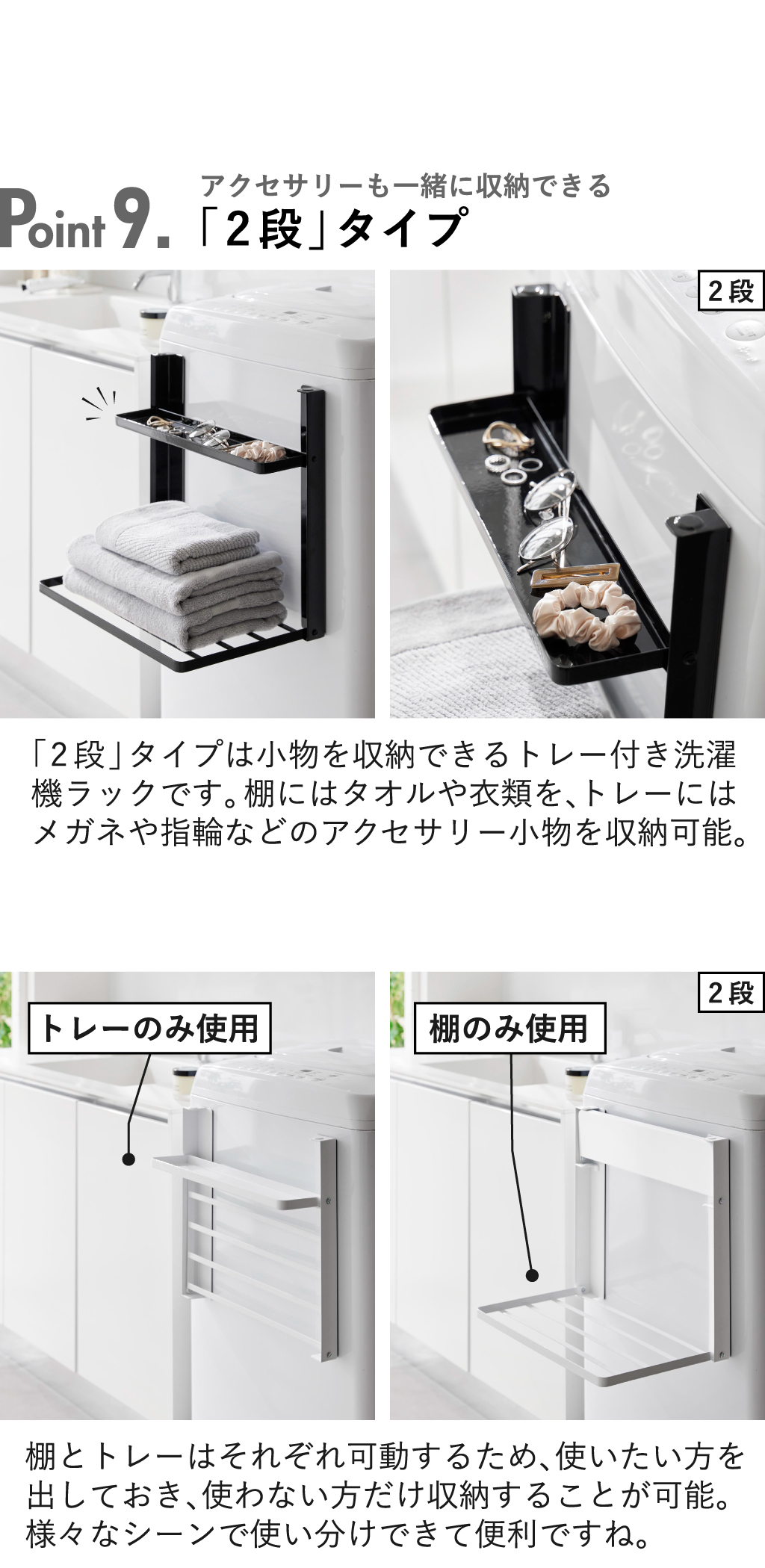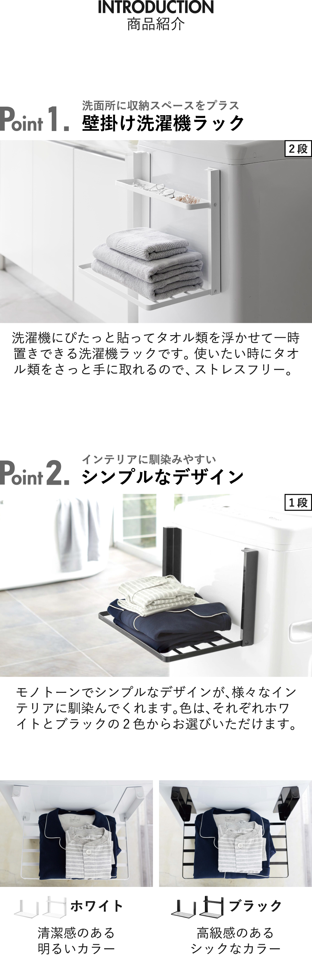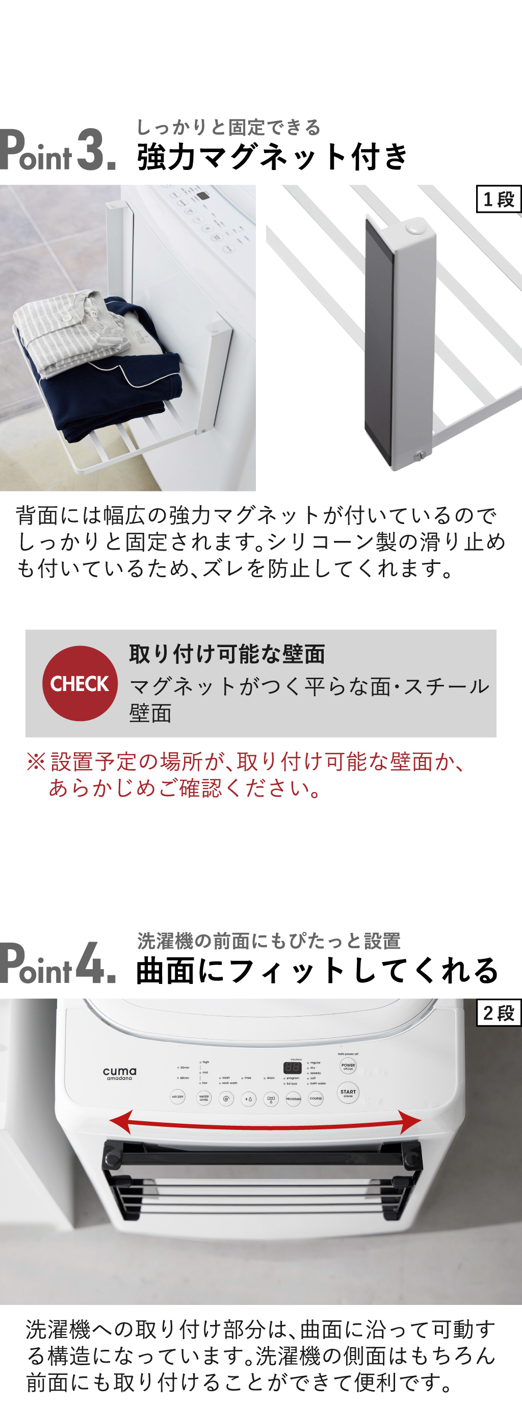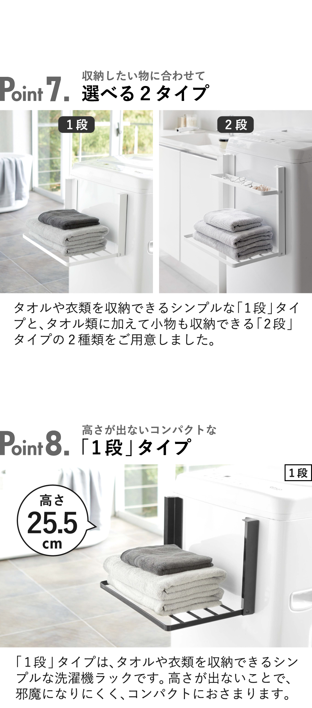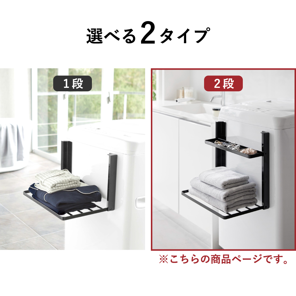お風呂上がりのバスタオルを一時置きできる、折りたたみ式の洗濯機ラックです。背面の強力マグネットで、洗濯機横にぴたっと貼り付けることができます。デッドスペースを洗濯機横収納にできるから、使いやすさアップ。取り付け部分は可動式なので、洗濯機前の曲面に沿ってフィットしてくれます。使わない時は、棚を上げて折りたためるので、通行の邪魔になりません。洗濯機横収納を設置することで、狭くなりがちな脱衣所スペースを広く使えて、ストレスフリー。横幅がワイドな洗濯機ラックなので、お風呂上がりの着替えの一時置きにもぴったりです。耐久性に優れたスチール製の洗濯機ラックだから、キズや汚れに強く、より長く使えます。洗濯機ラックは、収納したい物に合わせて「1段」と「2段」の2タイプから選択可能。「1段」は高さを出さずに、コンパクトに設置できる洗濯機横収納です。「2段」はトレー付きだから、アクセサリー小物も収納できる洗濯機横収納です。洗濯機ラックの色は、それぞれホワイトとブラックの2色からお選びいだだけます。