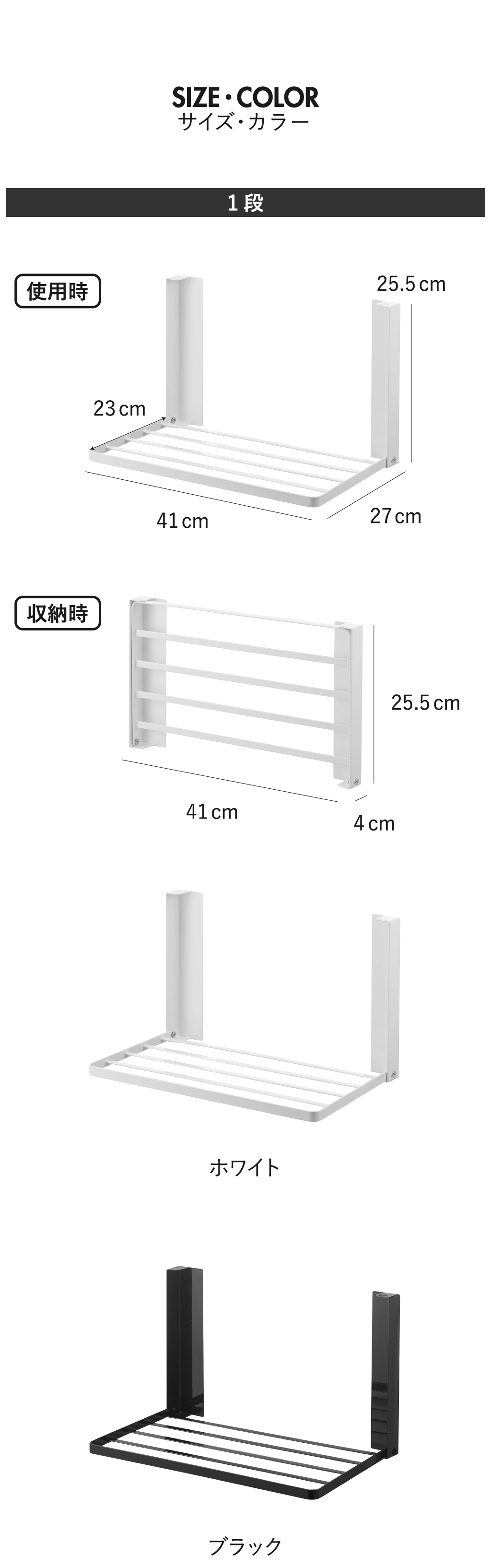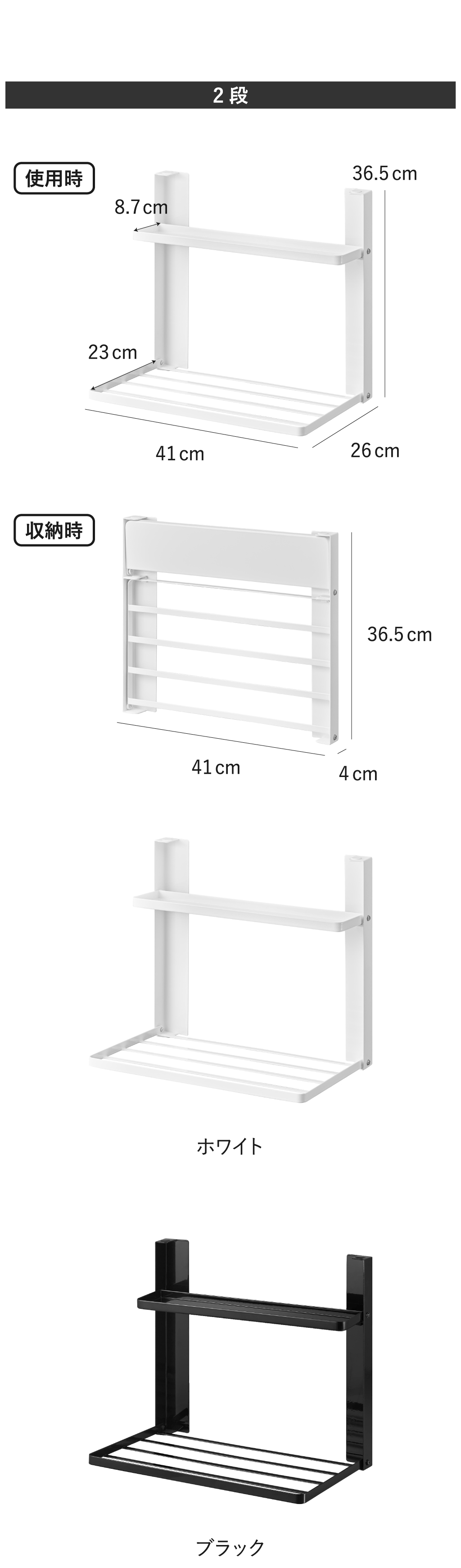 | サイズ | 使用時:約幅41cm×奥行き26cm×高さ36.5cm 収納時:約奥行き4cm (内寸) トレー:約幅39.5cm×奥行き8.7cm 棚:約幅39.5cm×奥行き23cm |