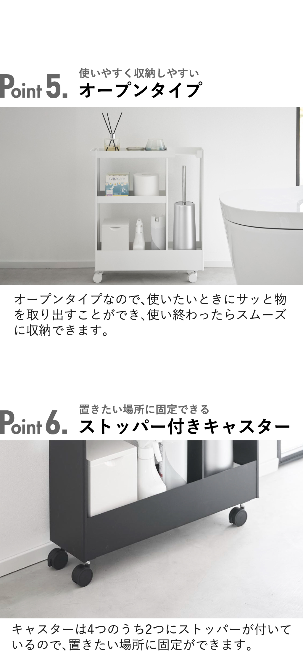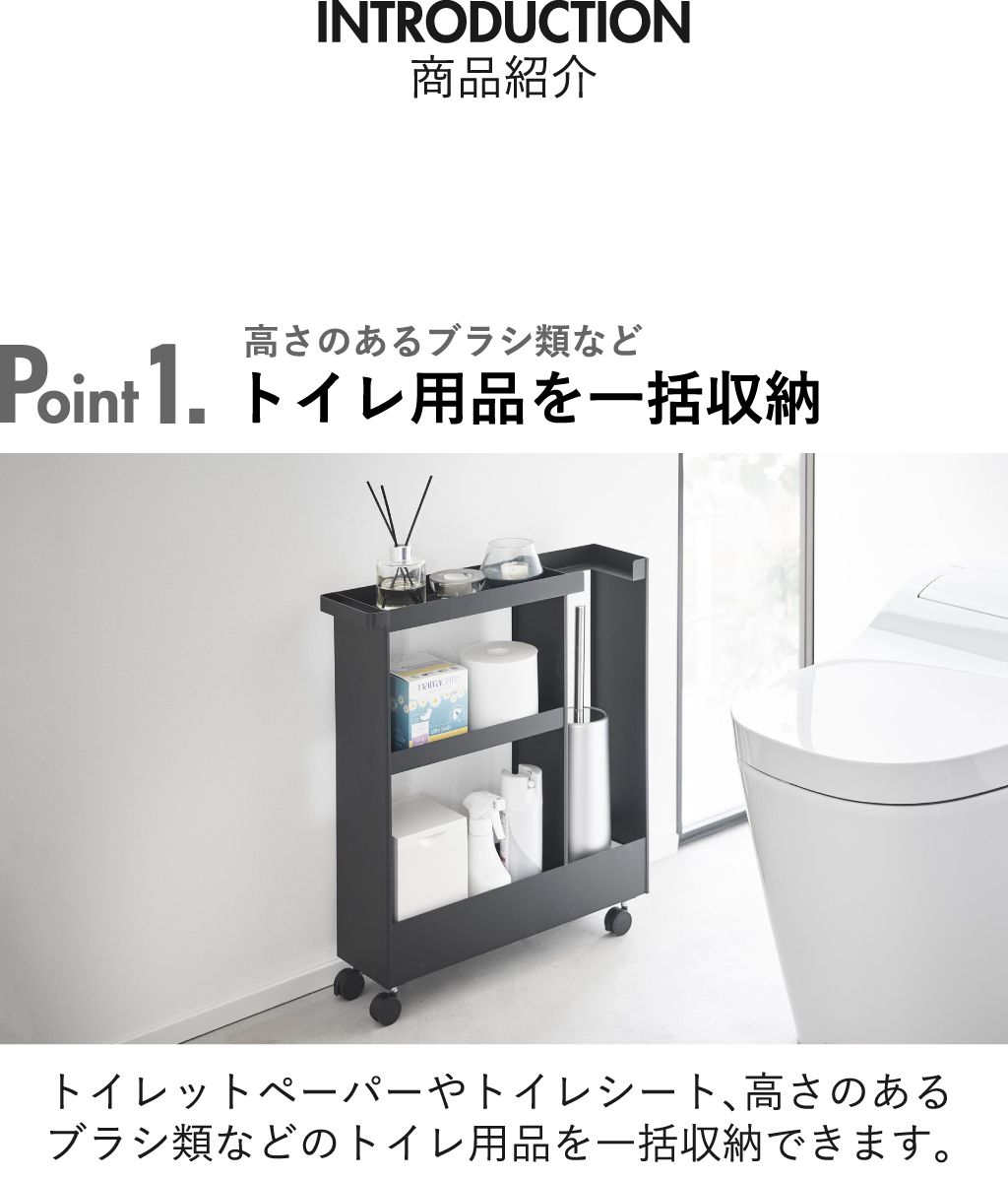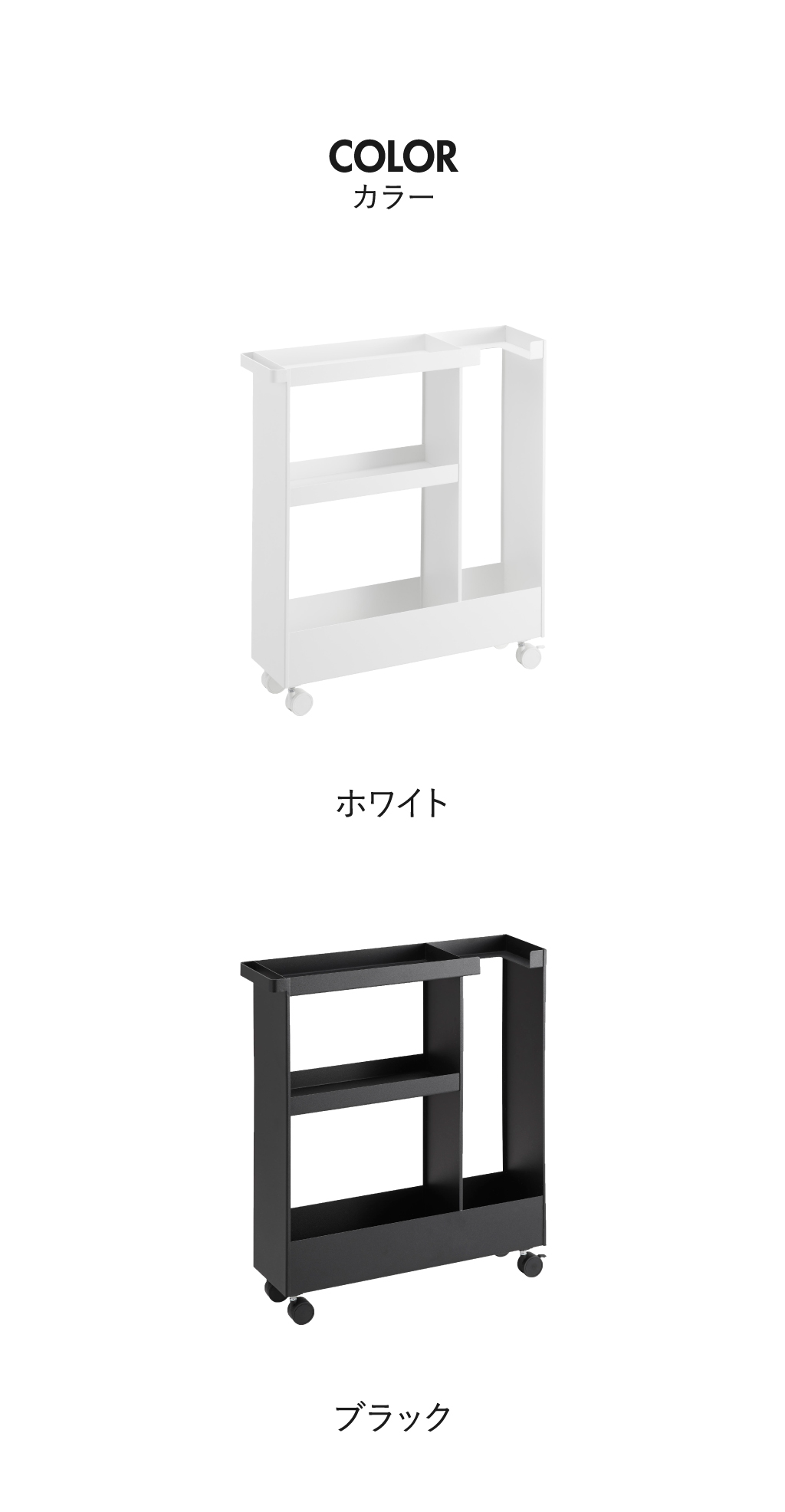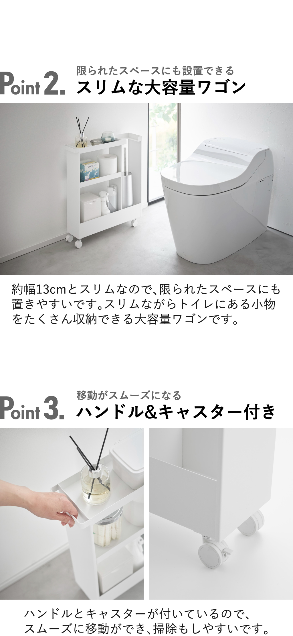 トイレ用品をひとまとめに収納できるトイレラックです。約幅13cmとスリム設計なので、限られたスペースに置くことができます。ラック部分は3段あり、上段にはディフューザーなどを、中段には替えのトイレットペーパー類、下段にはトイレポットやスプレー類を収納できます。3段に分けて物を置けるので、自分好みのトイレ収納にできます。スリムながらたっぷり収納できるので、トイレ収納にお困りの方におすすめです。ラックのフチには高さがあるので、移動の際に収納した物が落下する心配もありません。ワゴンにはハンドルとキャスターが付いているので、床掃除の際の移動もスムーズに。オープンタイプなので、使いたいときにサッと取り出せます。使い終わったらスムーズに収納が可能です。トイレラックの色はホワイトとブラックの2色からお選びいただけます。