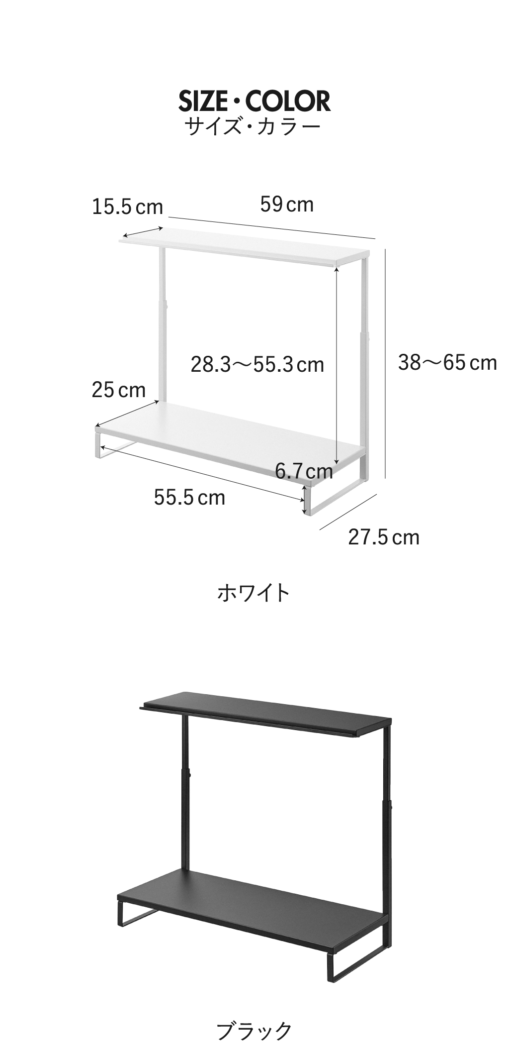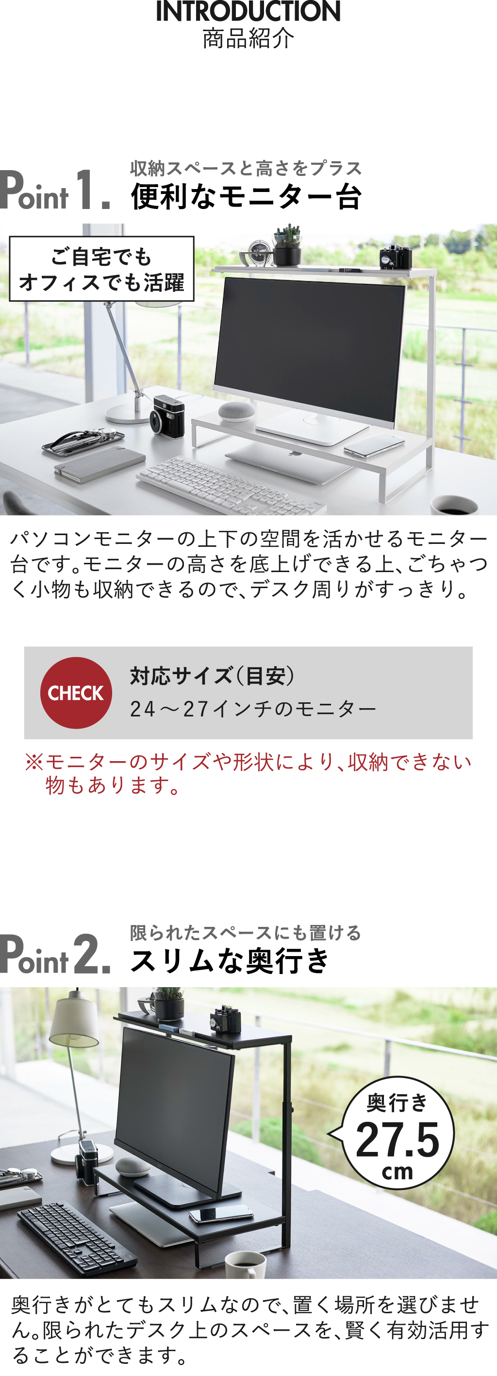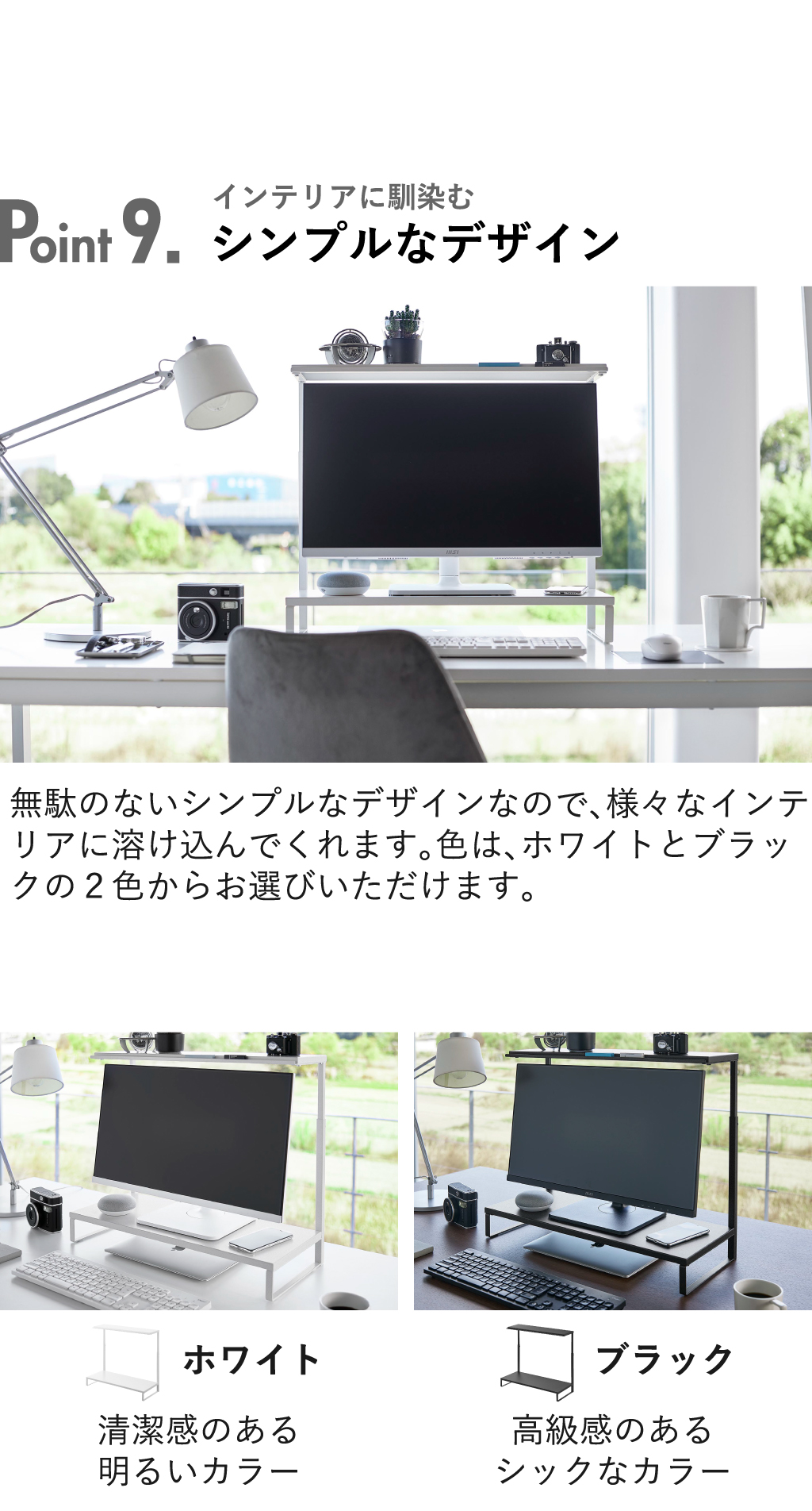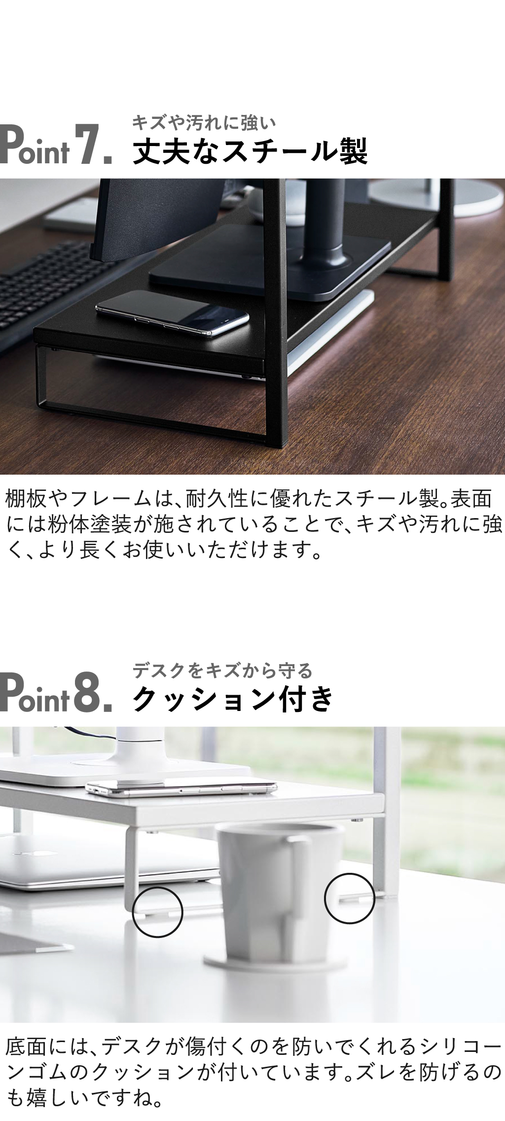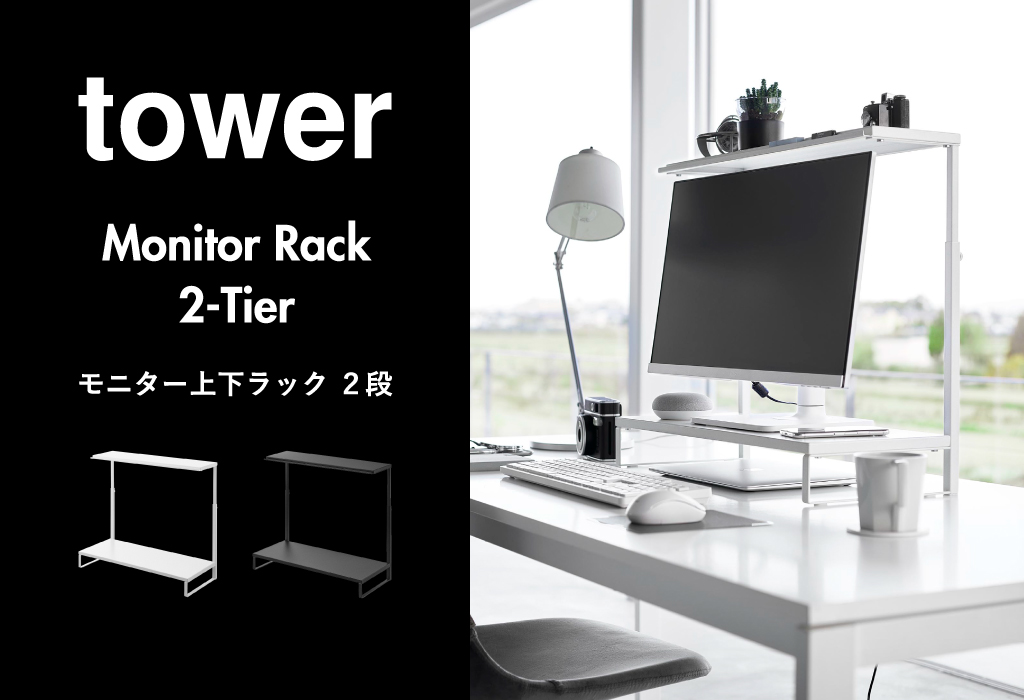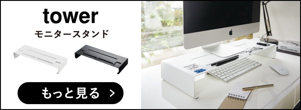 パソコンモニターの上下の空間を活かせる、towerの卓上モニター台です。モニターの高さを底上げできる上、ごちゃつく小物も収納できて、デスク周りがすっきり。スリムな卓上モニター台なので、限られたデスク上のスペースを賢く有効活用できます。モニターを載せつつ、モニター上にも収納スペースをプラスできる2段タイプ。卓上モニター台の下段は、その下の空間を活かして、キーボードやタブレットを収納。作業スペースをより広く確保できて、作業効率がアップ。卓上モニター台の上段は、写真立てや卓上カレンダーなどを置くディスプレイ台としても活躍。上段の手前側には溝があり、筆記具やふせんなどの小物も収納することができます。フレームに調節ネジが付いていることで、お手持ちのモニターに合わせて、高さ調節が可能です。モニター台は丈夫なスチール製なので、キズや汚れに強く、より長くお使いいただけます。無駄がなくシンプルなデザインなので、様々なインテリアに溶け込んでくれます。卓上モニター台の色は、ホワイトとブラックの2色からお選びいただけます。