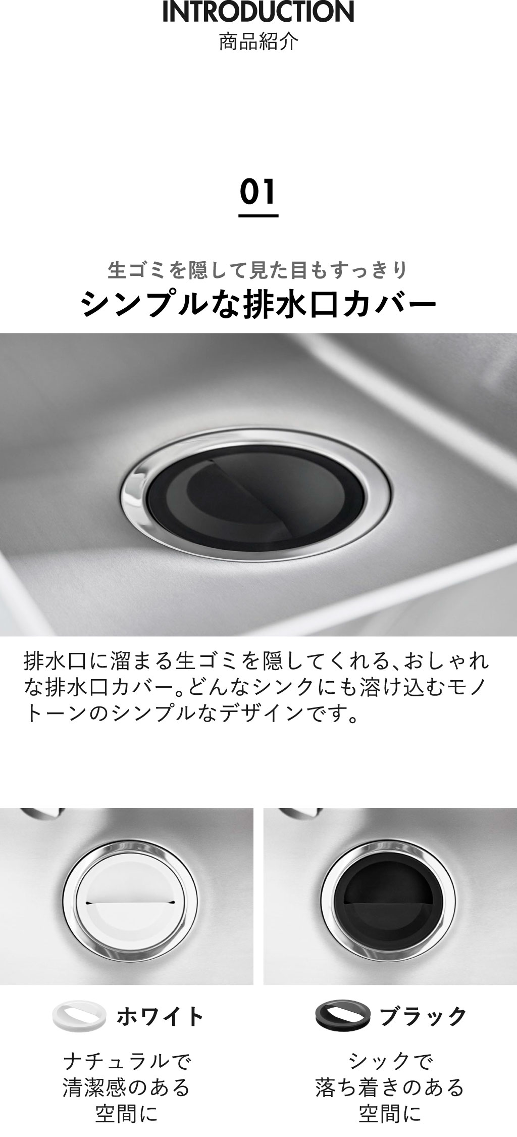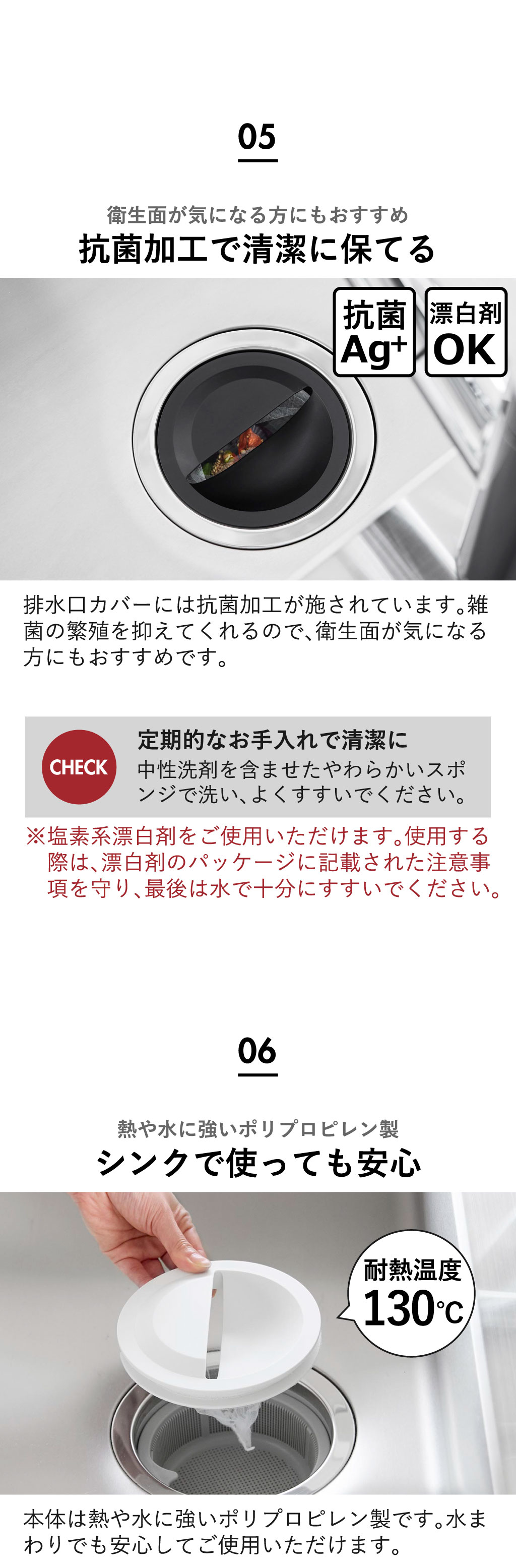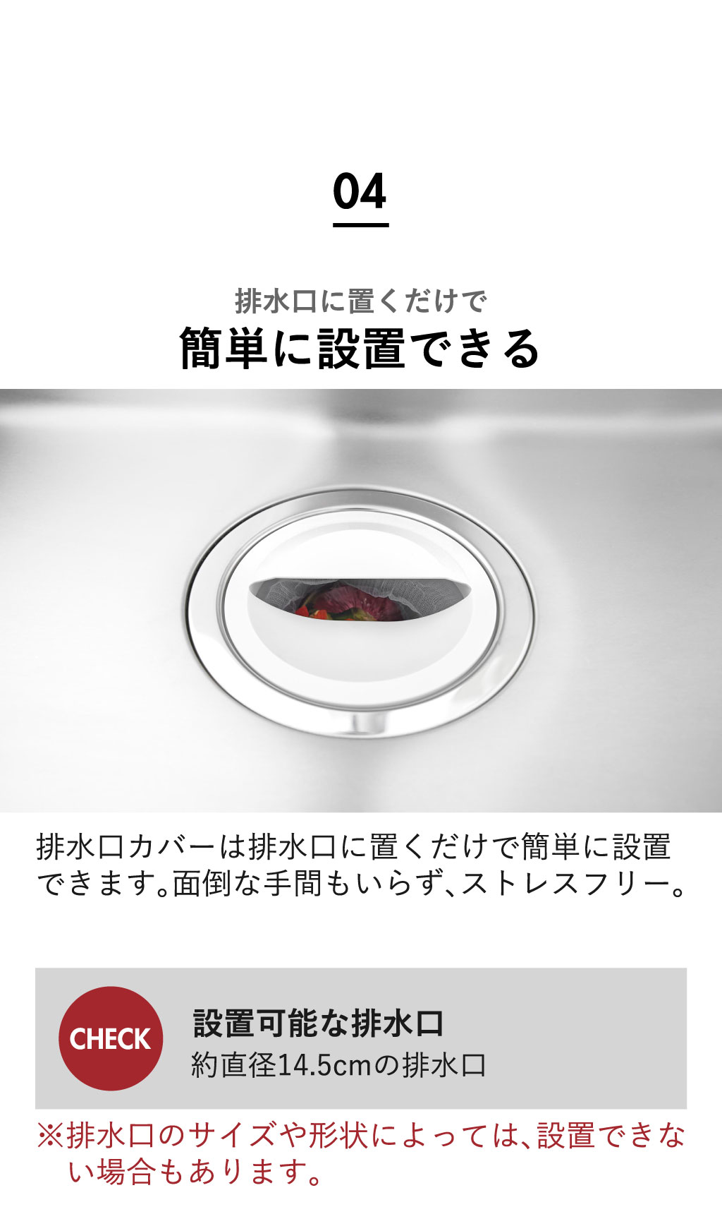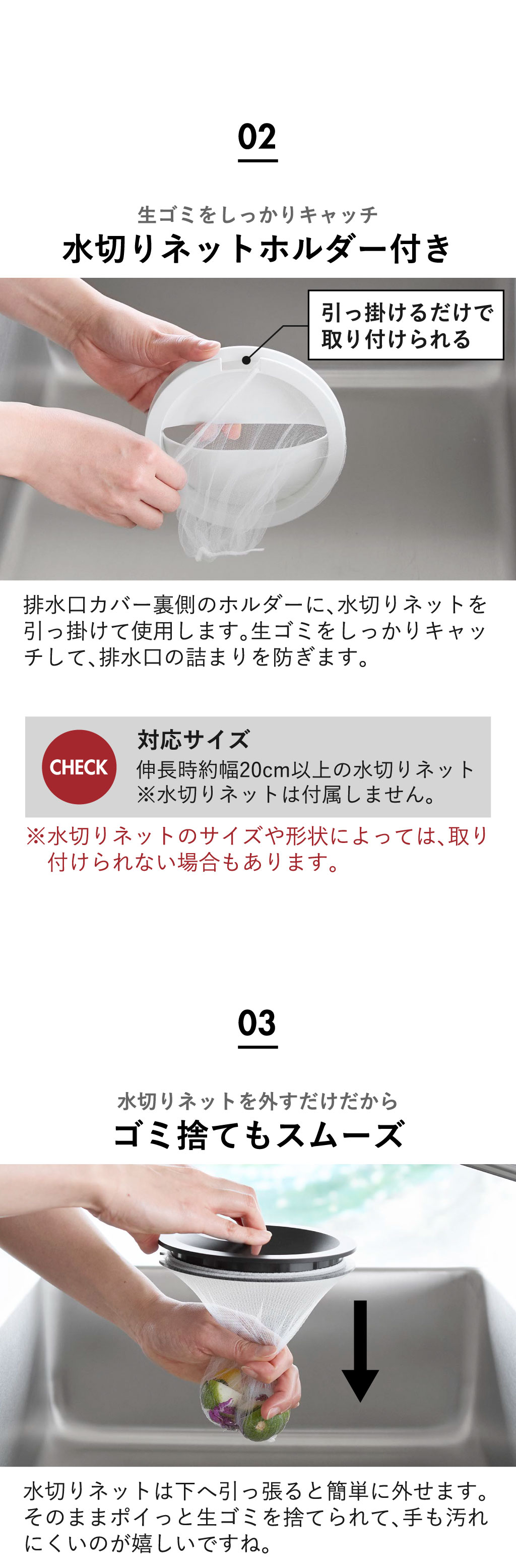 生ゴミを隠してシンクをすっきり見せてくれる、おしゃれな排水口ゴミ受けです。モノトーンのシンプルなデザインで、様々なキッチンに自然と馴染みます。排水口ゴミ受けの裏側には、水切りネットホルダーが付いています。水切りネットを引っ掛けて、生ゴミをしっかりキャッチできます。排水口の詰まりを防ぎ、お掃除の手間を減らせて便利です。水切りネットは下へ引っ張るだけで簡単に外せるため、ゴミ捨てもラクラク。排水口ゴミ受けは置くだけで設置でき、面倒な手間もかかりません。抗菌加工が施されているので、衛生面が気になる方にもおすすめです。中性洗剤で洗えるほか、漂白剤も使えるため清潔に保てます。排水口ゴミ受けは熱や水に強いポリプロピレン製。シンクでも安心してご使用いただけます。