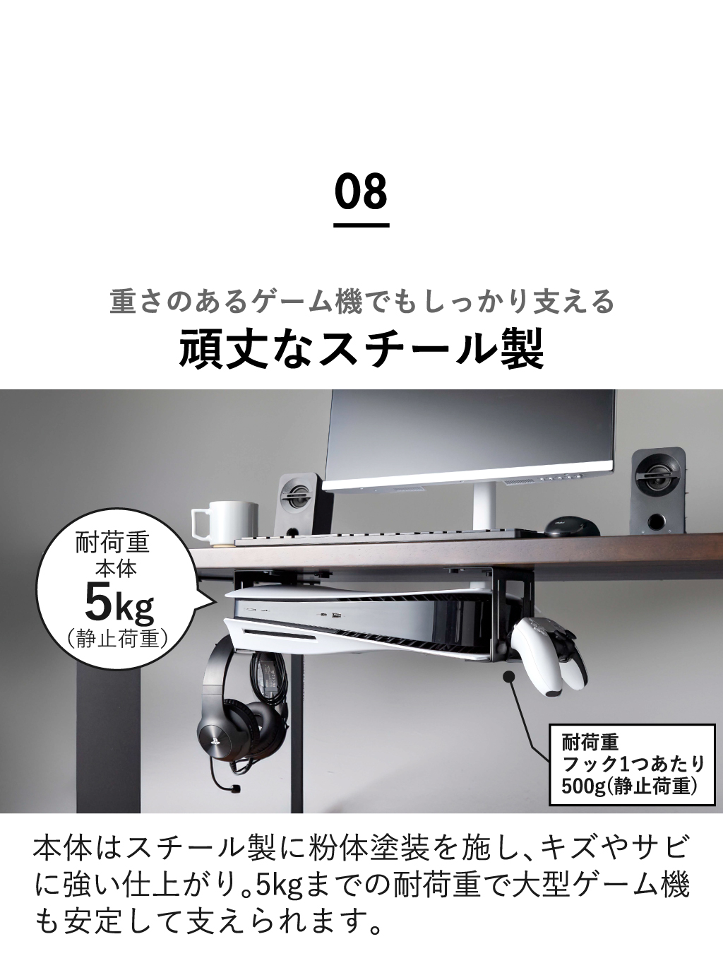 場所をとるゲーム機をすっきりデスク下に収納できる、便利なゲーム機収納ケースです。かさばりがちな本体を浮かせて設置できるので、ほこりが溜まりにくく床の掃除もラクラク。さらに、大きな開口部で排熱を妨げず、本体の冷却効果をしっかり保てる安心設計になっています。手で回せる調節ネジを採用しているため、設置する本体のサイズに合わせてスムーズに微調整可能。可動式の固定ホルダーは斜めにも固定できるので、さまざまな形状のゲーム機に対応します。また、ゲーム機を傷つけないシリコーン付きで、大切な本体を安心して収納できます。付属のフックはお好みの位置に取り付けられ、コントローラーやヘッドセットもまとめて収納できます。このゲーム機収納ケースは、丈夫なスチール製で、耐荷重は本体が5kg、フック1つあたり500g(静止荷重)で、重さのあるゲーム機にも対応。デスクやテーブル、キッチンカウンター下に木ネジでしっかり取り付けられる仕様です。インテリアに馴染むシンプルなデザインのゲーム機収納ケースは、リビングやワークスペースをすっきり快適に保ち、毎日のゲーム時間をより楽しく演出してくれます。