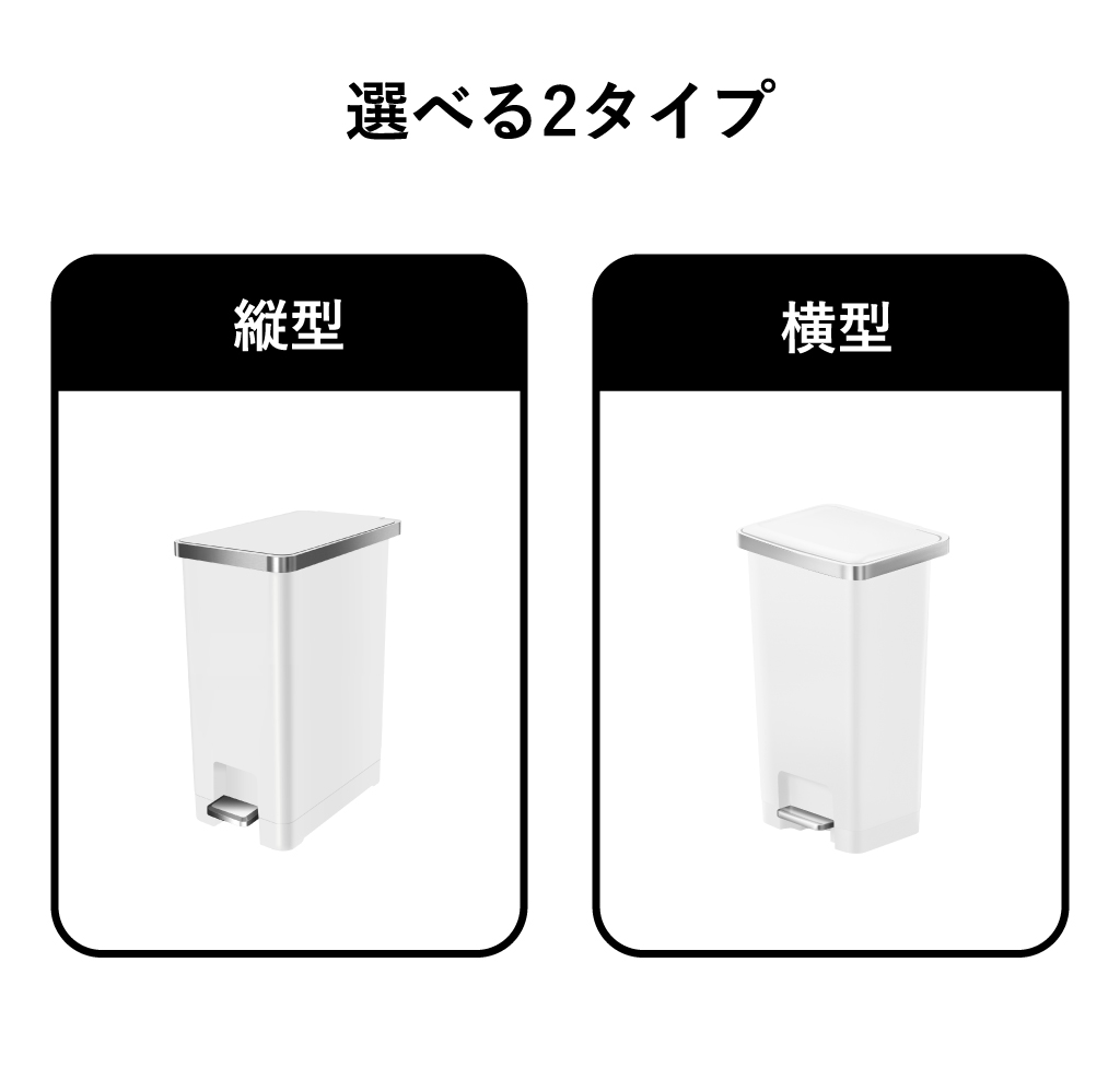両手がふさがっていてもゴミ捨てができる45リットルのペダル式ゴミ箱。手を使わないので、衛生的にゴミを捨てることができます。ソフトクロージング機能で、フタがゆっくり静かに閉まります。45Lのペダル式ゴミ箱はスムーズに移動できるよう、本体下部の後方に2輪のキャスターが付いています。少し持ち上げるだけで簡単に動かせます。ゴミ箱の表面は、指紋や汚れが付きにくいマット素材。汚れてもサッと拭き取るだけで清潔を維持できます。置く場所に合わせて「縦型」と「横型」2タイプからお選びいただけます。