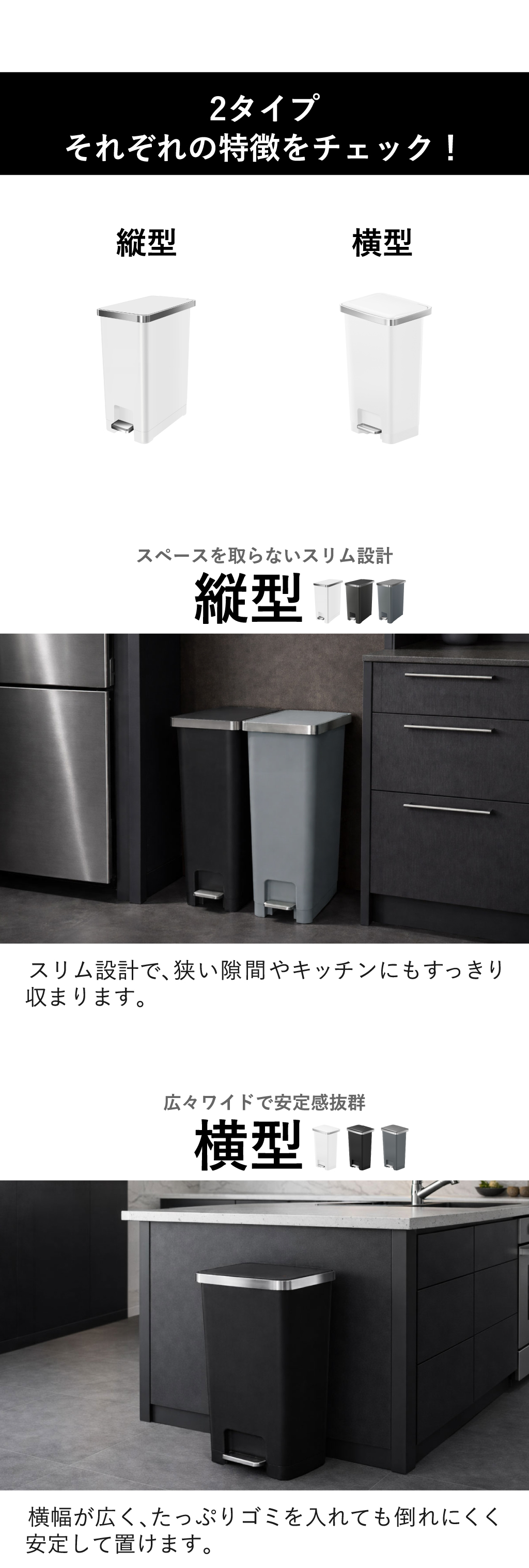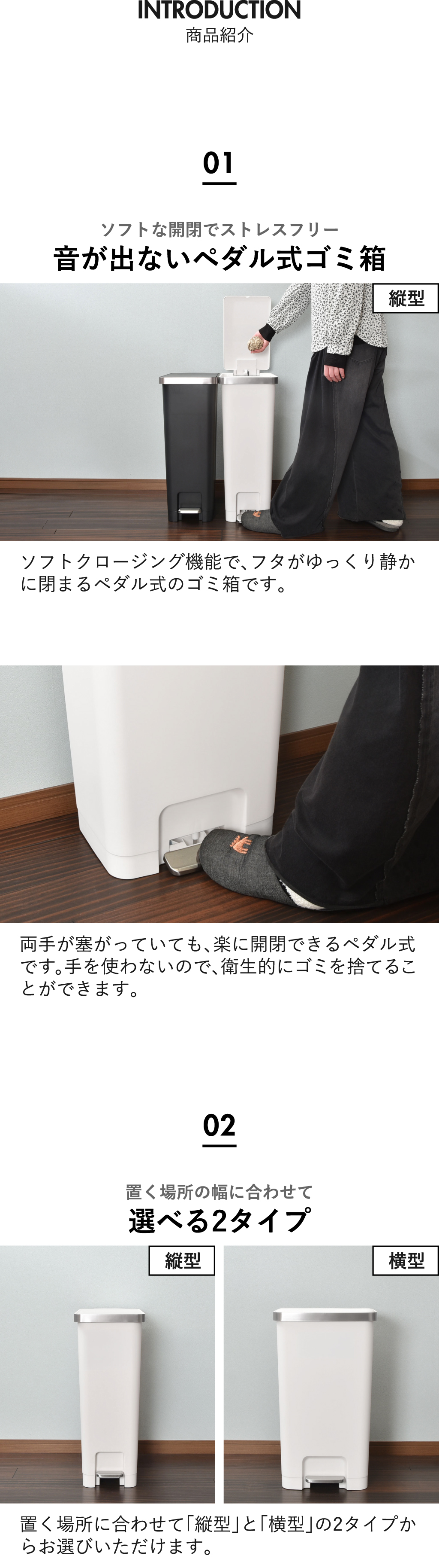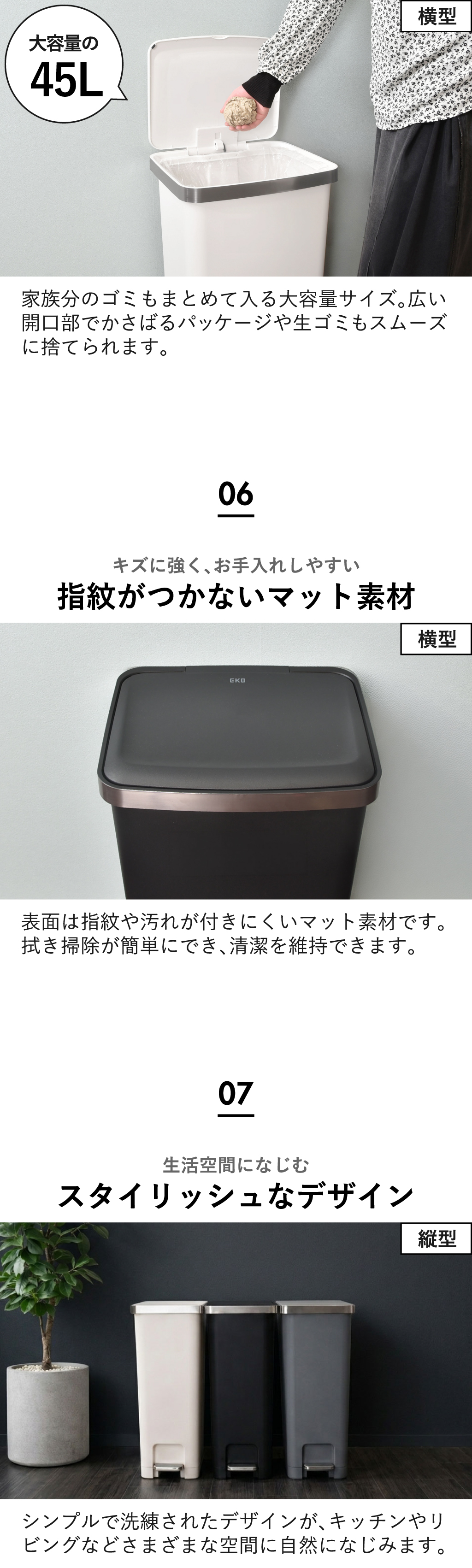 両手がふさがっていてもゴミ捨てができる45リットルのペダル式ゴミ箱。手を使わないので、衛生的にゴミを捨てることができます。ソフトクロージング機能で、フタがゆっくり静かに閉まるので、夜間でも安心してお使いいただけます。フタを一番上まで開けると固定できるので、ゴミ箱の上で作業や袋の交換が楽にできます。ペダル式ゴミ箱は、袋止めが付いているのでゴミ袋のズレやはみ出しを防げます。外からゴミ袋が見えず、生活感を抑えることができます。また、45Lのペダル式ゴミ箱には掃除の際にスムーズに移動できるよう、本体下部の後方に2輪のキャスターが付いています。少し持ち上げるだけで簡単に動かせます。ゴミ箱の表面は、指紋や汚れが付きにくいマット素材。汚れてもサッと拭き取るだけで清潔を維持できます。置く場所に合わせて「縦型」と「横型」2タイプから選べる45リットルのペダル式ゴミ箱。スペースを取らないスリム設計の縦型は、狭い隙間やキッチンにもすっきり収まります。広々ワイドで安定感抜群の横型は、横幅が広くたっぷりゴミを入れても倒れにくく安定して置けます。たっぷり捨てられる45Lの大容量サイズ。広い開口部で、かさばるパッケージや生ゴミもスムーズに捨てられます。シンプルで洗練されたデザインがキッチンやリビングなどさまざまな空間に自然になじみます。