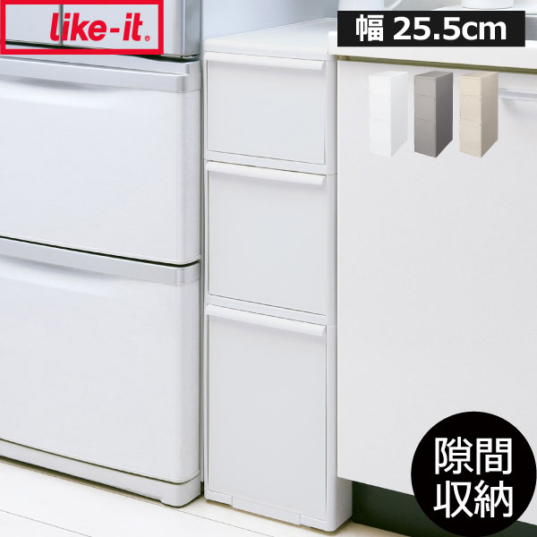 キッチンや洗面所などのちょっとした隙間を有効活用して収納スペースを増やせる収納ケース。幅が3種類14cm、17cm、25.5cmと隙間に合わせて組み合わせも自由自在。この収納ケースは、側面がフラットなので、ほこりが溜まらずお手入れもラクラク。シンプルなデザインでどんな部屋でも馴染みやすいのが特徴です。引き出しの中身が見えないので生活感を隠すこともできます。引き出しには、軽い力でもスッと開閉できる握りやすい取っ手と、万が一引き出しを勢いよく引き出してしまっても安心のストッパーが付いています。