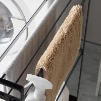 収納スペースが充実したスリムなタオルハンガーです。約15cmの隙間に収まり、洗濯機横などのデッドスペースに置くことができます。キャスターが付いているので移動も楽々。バスタオルを最大4枚収納することができ、中段にはバスマットの収納も可能です。下部には収納トレー付きで、洗剤のボトルや詰め替え用洗剤のストックなど、洗濯機まわりのグッズをひとまとめにできて便利です。付属のフックでブラシなどの小物も収納できます。丈夫なスチール製です。