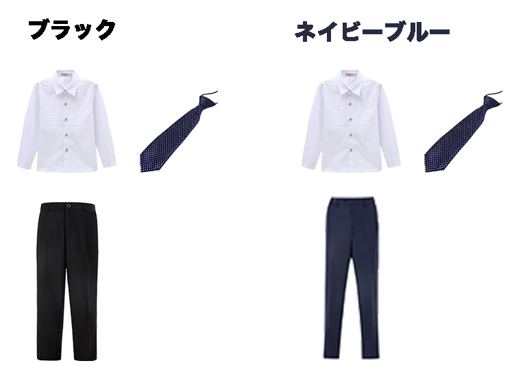 ズボン、ワイシャツ、子供用ネクタイ(ゴム仕様、水玉ネイビーブルー)の3点セット