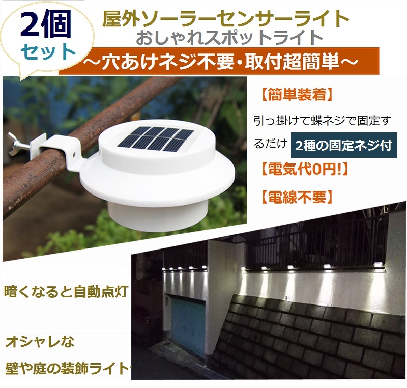 ソーラーライト屋外 照明 ガーデンライト 2個セット ネジ不要 取付便利 ソーラー センサーライト カーポート ウッドデッキ ベランダ 手すり おしゃれ 防水