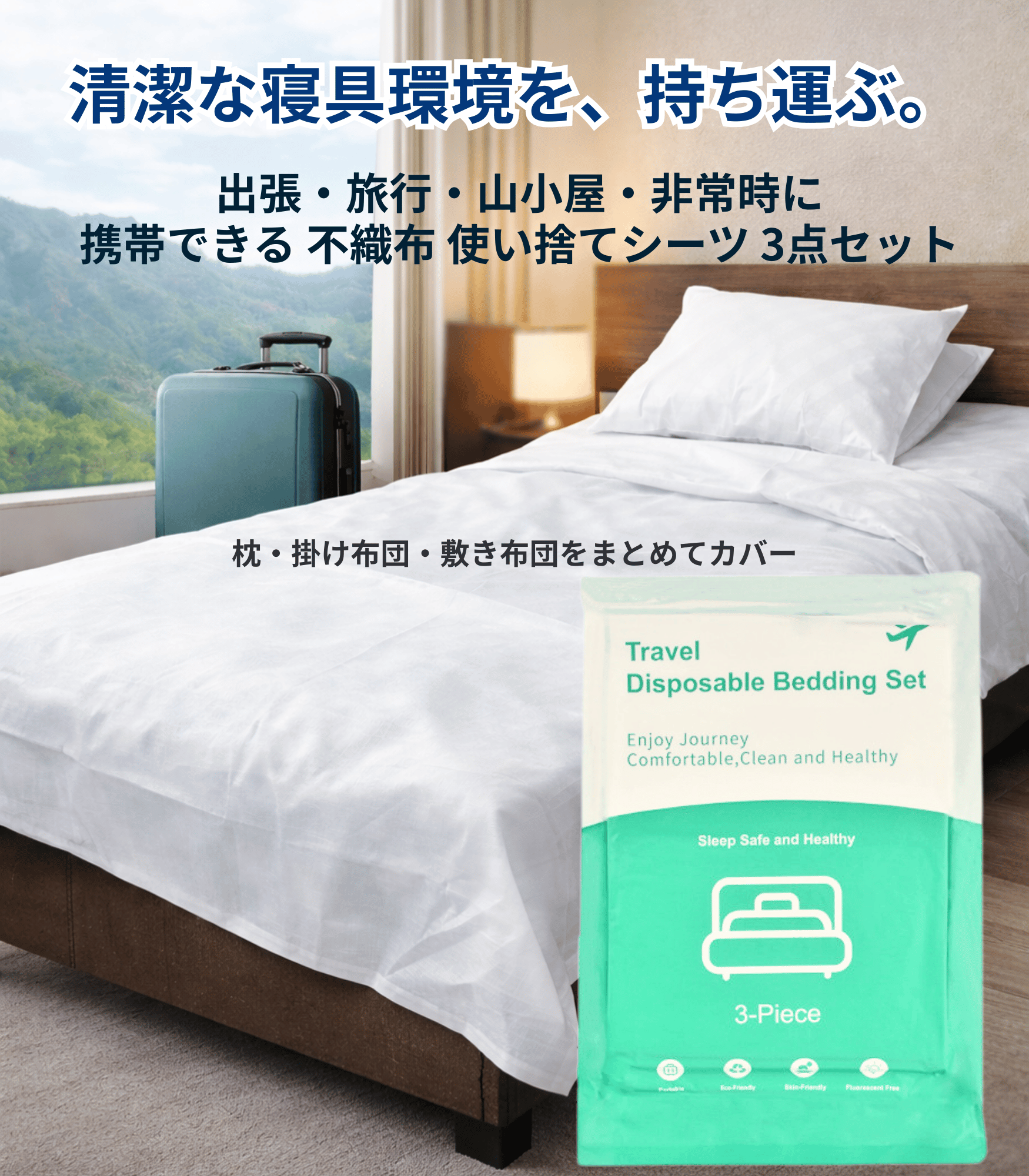 旅行や出張時に清潔な寝具環境を整えたい方に向けた、不織布素材の使い捨て寝具(枕カバー・掛け布団カバー・敷き布団カバー/シーツ)3点セットです。