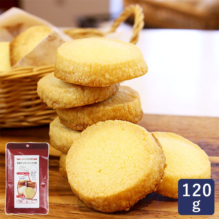 秋田県産あきたこまちの米粉と北海道産の砂糖を使用した、米粉のクッキーミックスです。ミックス粉のほかには、卵黄とマーガリンまたはバターなど、手に入りやすい材料をご用意いただくだけで、さっくりとした食感とやさしい甘さのクッキーを手軽にお作りいただけます。