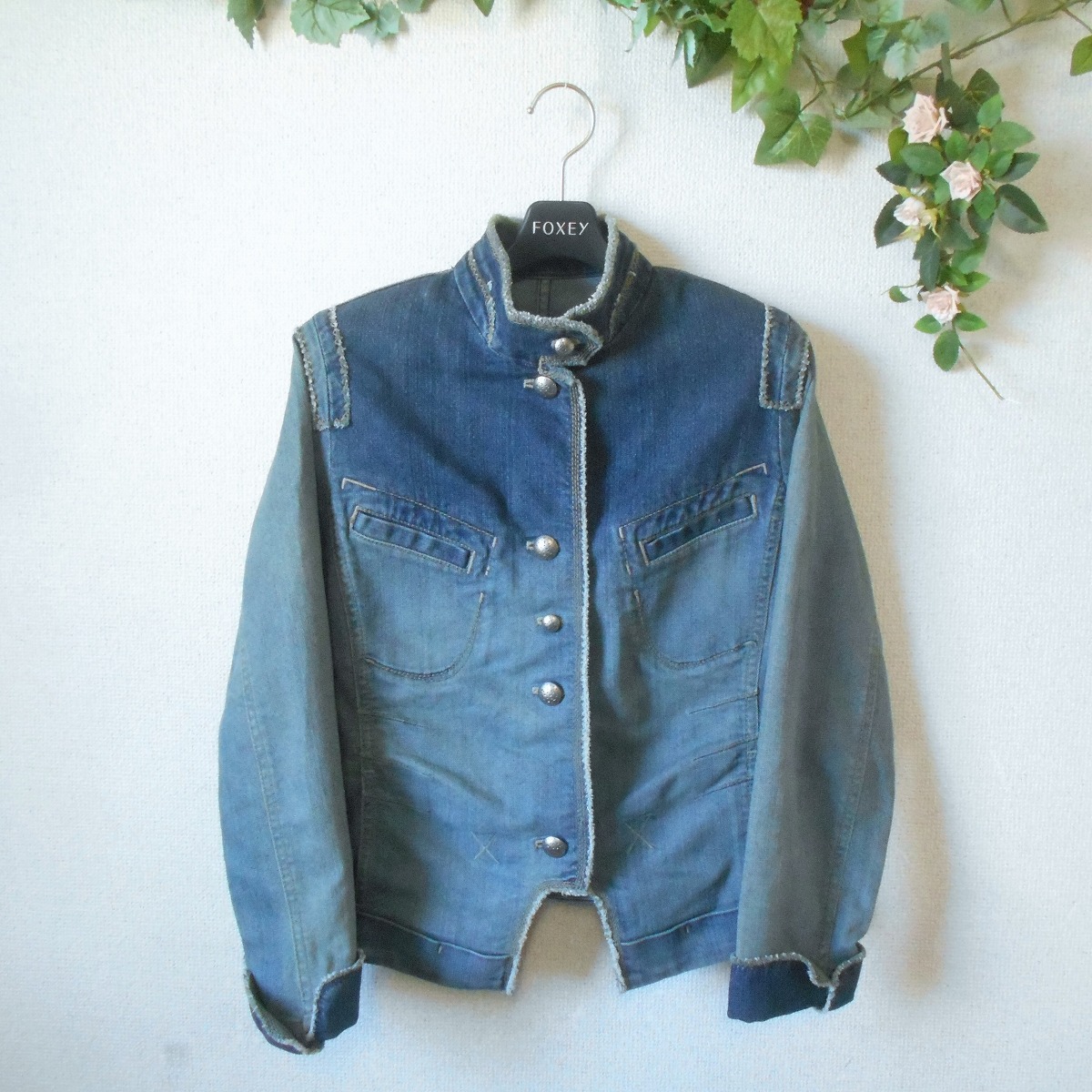 【ポイント】イオコモードのデニムジャケットになります。インディゴブルーのUSED加工で春や秋を中心に着ていただけるお品です。前はボタン式でとってもお洒落なデザインです。