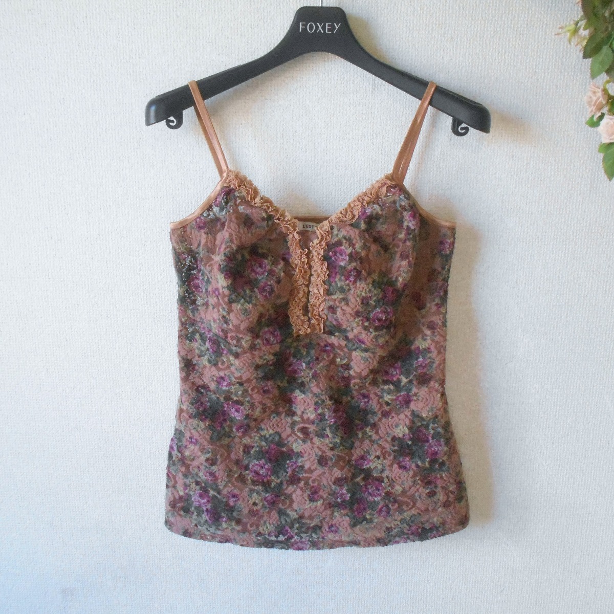 【ポイント】レストローズのキャミソールビスチェになります。お色は濃いベージュ系のベースカラーで、多色使用の花柄が全体に入っています。