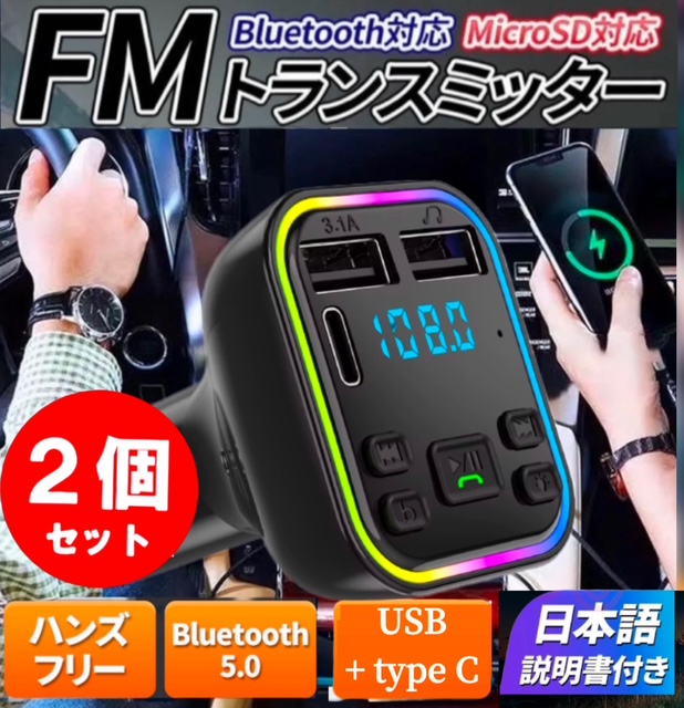 2個セット※FMトランスミッター Bluetooth 5.0 タイプC Type-c USB2口 mp3 急速充電 ハンズフリー シガーソケット スマホ 音楽再生※日本語説明書付き