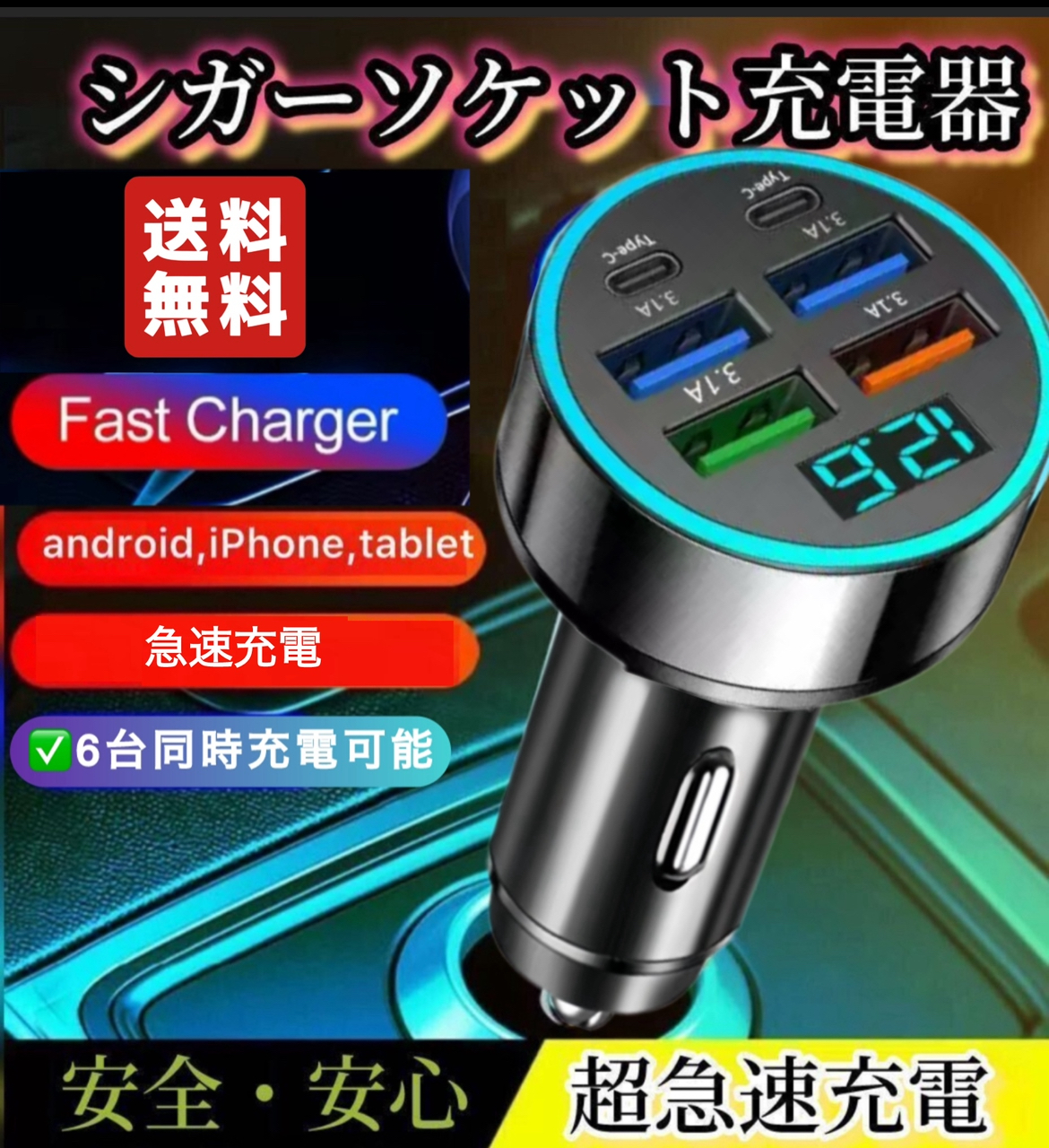 シガーソケットにさすだけで簡単にUSBを増設出来るカーチャージャーです。6つのデバイスを充電出来るのはもちろん、高速充電にも対応しているので素早くデバイスを充電することが出来ます。12/24vともに対応しているので、色々な車でご使用いただけます。また電圧表示機能もついているので、つけているだけで愛車の状態を確認できます。設置状態では綺麗に光ってアクセントにも◎!