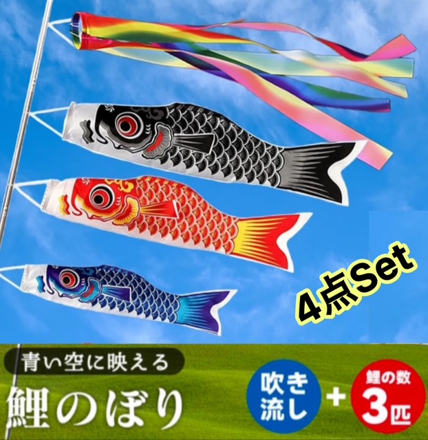 4点セット\祝日も発送!/【鯉のぼり3匹+1.4m吹流し】 ベランダ・庭園にぴったり♪カラフルファミリーセット! 初節句・端午の節句お祝いに!◎ ギフトにも!