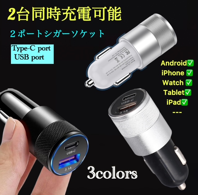2ポート(USB1ポート+TYPEC1ポート) シガーソケット USB 携帯 充電 増設 iPhone 電源 車載 カーチャージャー 12V 24V 急速充電 ANDROID充電