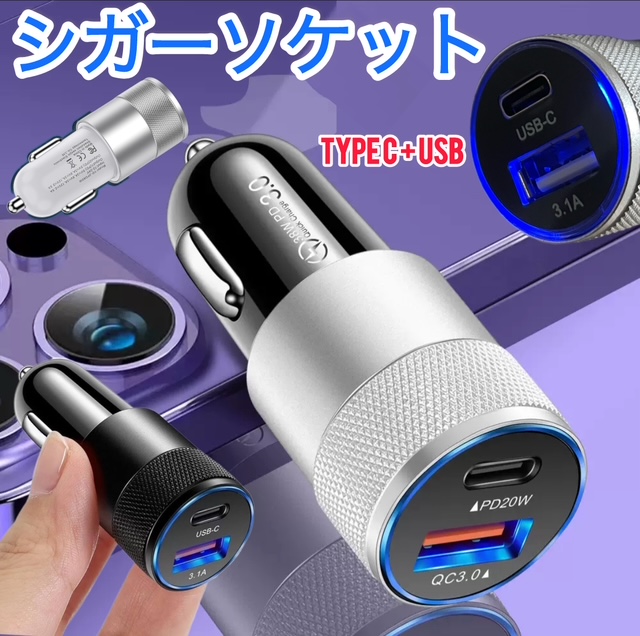 2ポート(USB1ポート+TYPEC1ポート) シガーソケット USB 携帯 充電 増設 iPhone 電源 車載 カーチャージャー 12V 24V 急速充電 ANDROID充電
