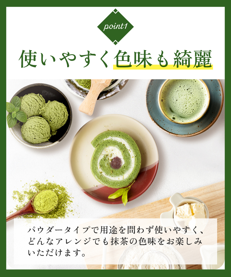 【高い着色力と安定した品質】焼き菓子でも抹茶本来の鮮やかな緑色を保つことができ、焼成後も風味が損われにくい!プロのパティシエにも支持される確かな品質です。
