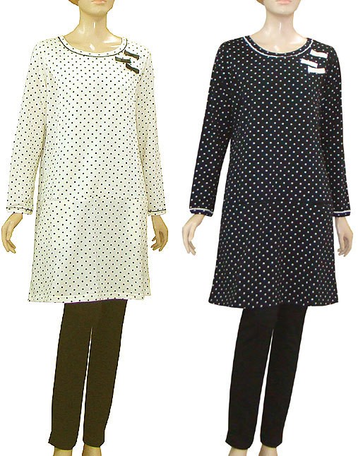 左肩口の3つのサテンリボンモチーフとドット柄が相まって非常にキュートでかわいい、マタニティハウスウエア兼ラウンジパジャマ