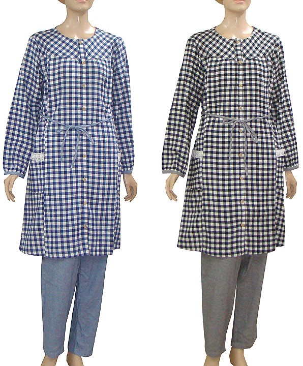 バスト部分でバイアスに切替を入れ、アウトポケットにオフホワイトのレースを施した、授乳口付のかわいいチェック柄のマタニティパジャマ