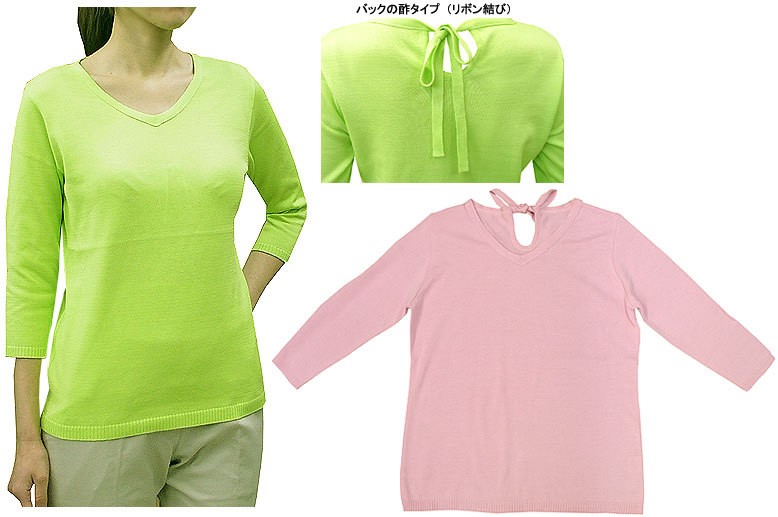 Vネック後ろリボン結び七分袖ニット
