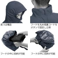 ◎仕様:長つば構造で髪や顔が雨に濡れにくく視界を確保、フードを丸め襟裏コードをボタンで固定し立襟に、ムレを軽減する背中ベンチレーション、視認性を高めたワイド再帰性反射、フードの中に収納が可能(フード表生地側にウェア上下を収納し襟裏コードをフードのつば裏ループに通しボタンで固定)、ボタンで2段階の裾口調節