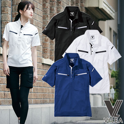 ◎商品説明:薄手でポリエステル100%素材のポロシャツ。吸汗性に優れ着心地が良よくVILEAロゴ入りドット釦を使用。両胸にファスナー付きポケット。