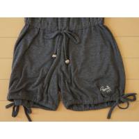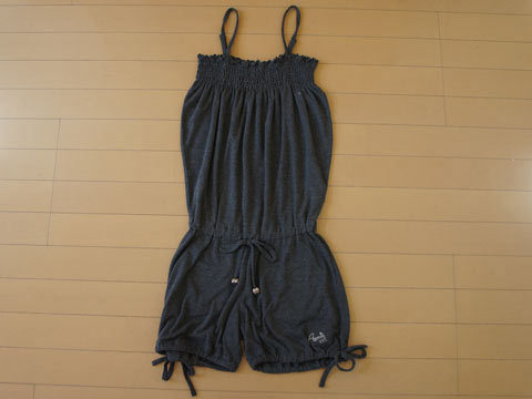 お色はダークグレー。ポリエステル65%レーヨン35%の少々光沢感のあるカットソー素材。全体に少々毛羽立ちやや大。着用感やや大。身幅、胸のゴムシャーリングの辺りで平置きで約56cm、ゴムシャーリングの下で伸ばしきった状態で約43cm。着丈、肩紐から股上まで約82cm、股下約10cm。ブランドタグ、POM PONETTE AMIEとなっています。インナーにプルオーバーやキャミソール等と重ね着するタイプだと思います。