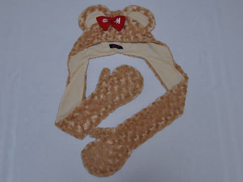 数回着用程度の綺麗な印象のお品。帽子とマフラーと手袋 ミトンが一体化しているデザイン。お色はベージュ。裏面も起毛感のある素材。サイズはフリーサイズだと思われます。ミトンもやや大きめのため約120cm-140cm程度のお子様向けだと思います。長さ後ろ中心からミトンの先までで約82cm。間のマフラー兼ミトンまでの部分で約幅10cm。