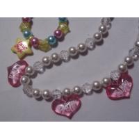 数回使用程度の綺麗な印象のお品。ネックレスとブレスレットの2点セット。元々別売りだと思いますが、セット販売とさせていただきます。ネックレスは人工パール風のビーズとプラスチックの透明ビーズが使われています。ロゴ部分はピンクのプラスチック。長さ約66cmぐらい、さらに調節少々可能。ブレスレットはピンクと水色のパール風のビーズと黄色いラメ入りの星のビーズの組み合わせ。ロゴが入っている部分は、黄色のパールがかったお色になっています。伸びるゴムになっています。長さ約14cm程度。